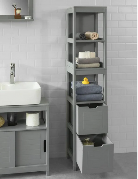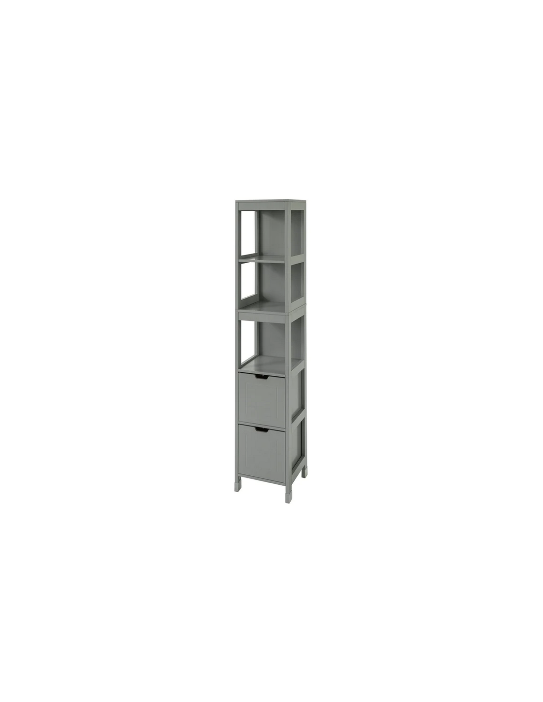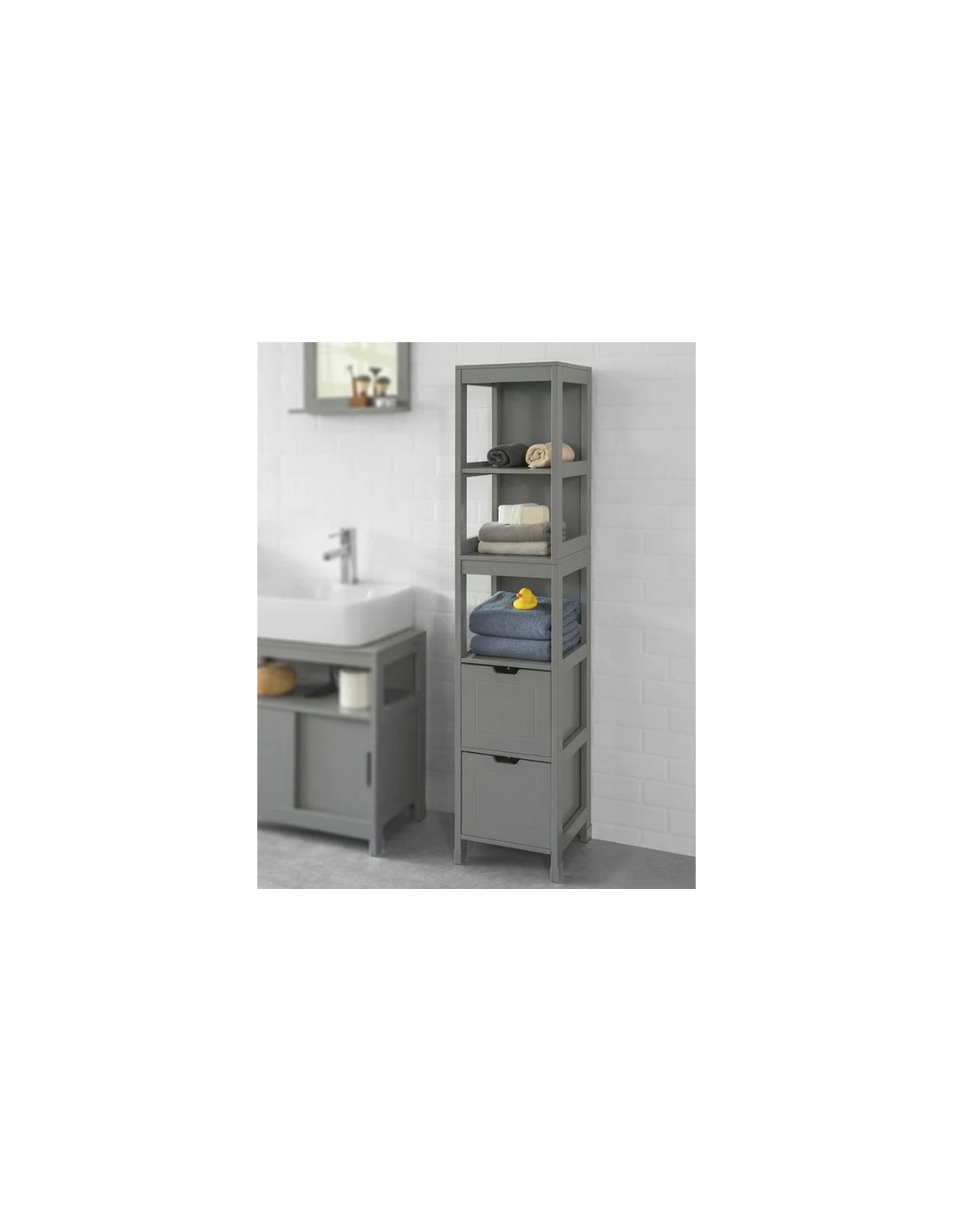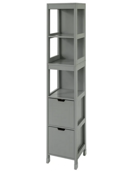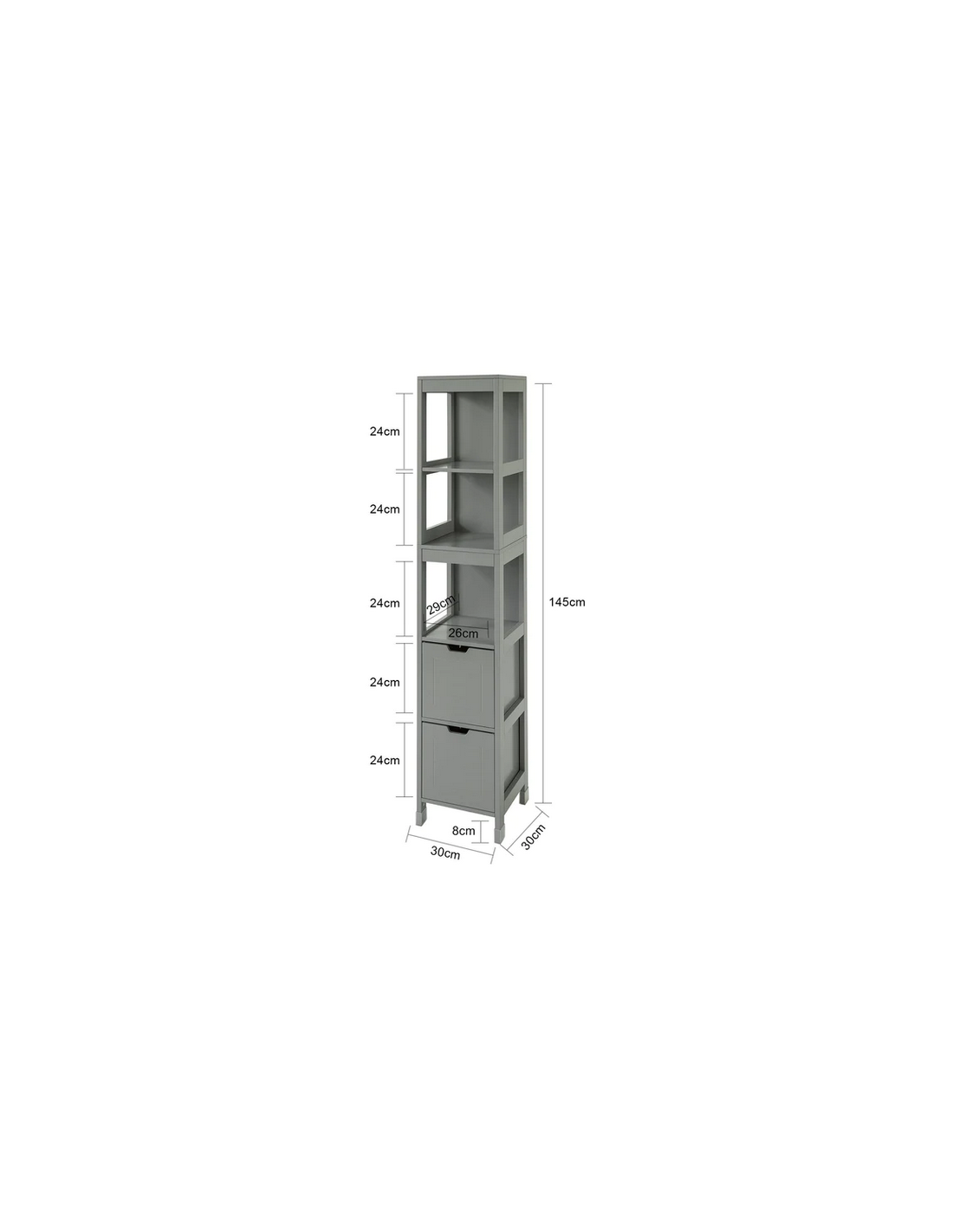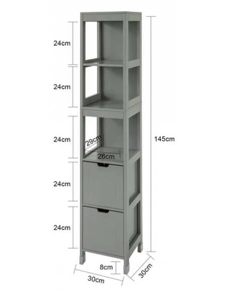 Skab til badeværelset, udført i et design af grå møbelplade. Skabet måler 145 cm i højden og 30 x 30 cm i bredde og dybde.