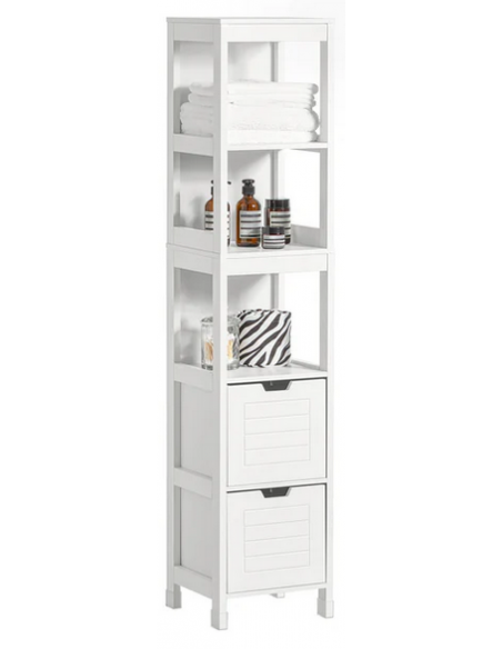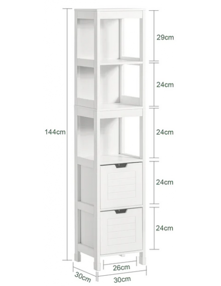 Skab til badeværelset, udført i et design af hvid møbelplade. Skabet måler 144 cm i højden og 30 x 30 cm i bredde og dybde.