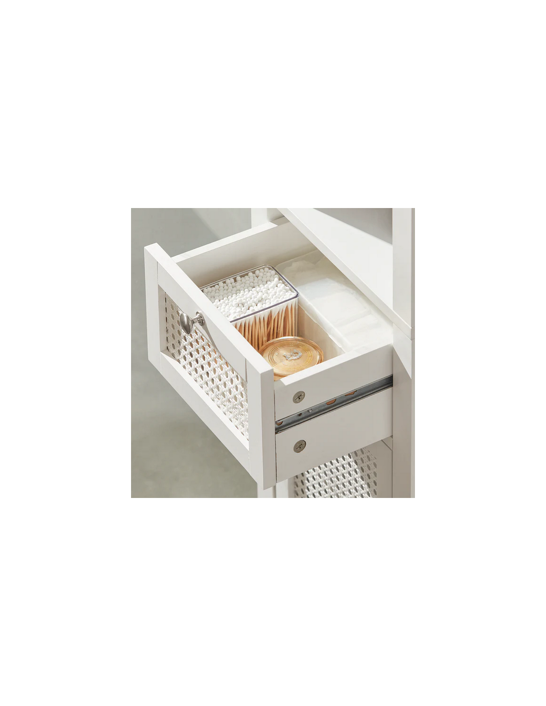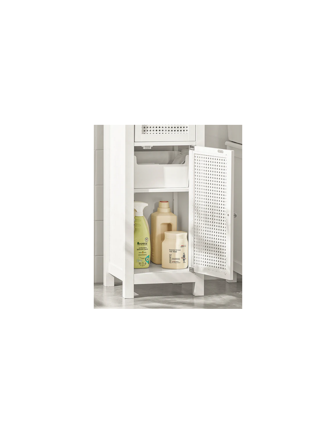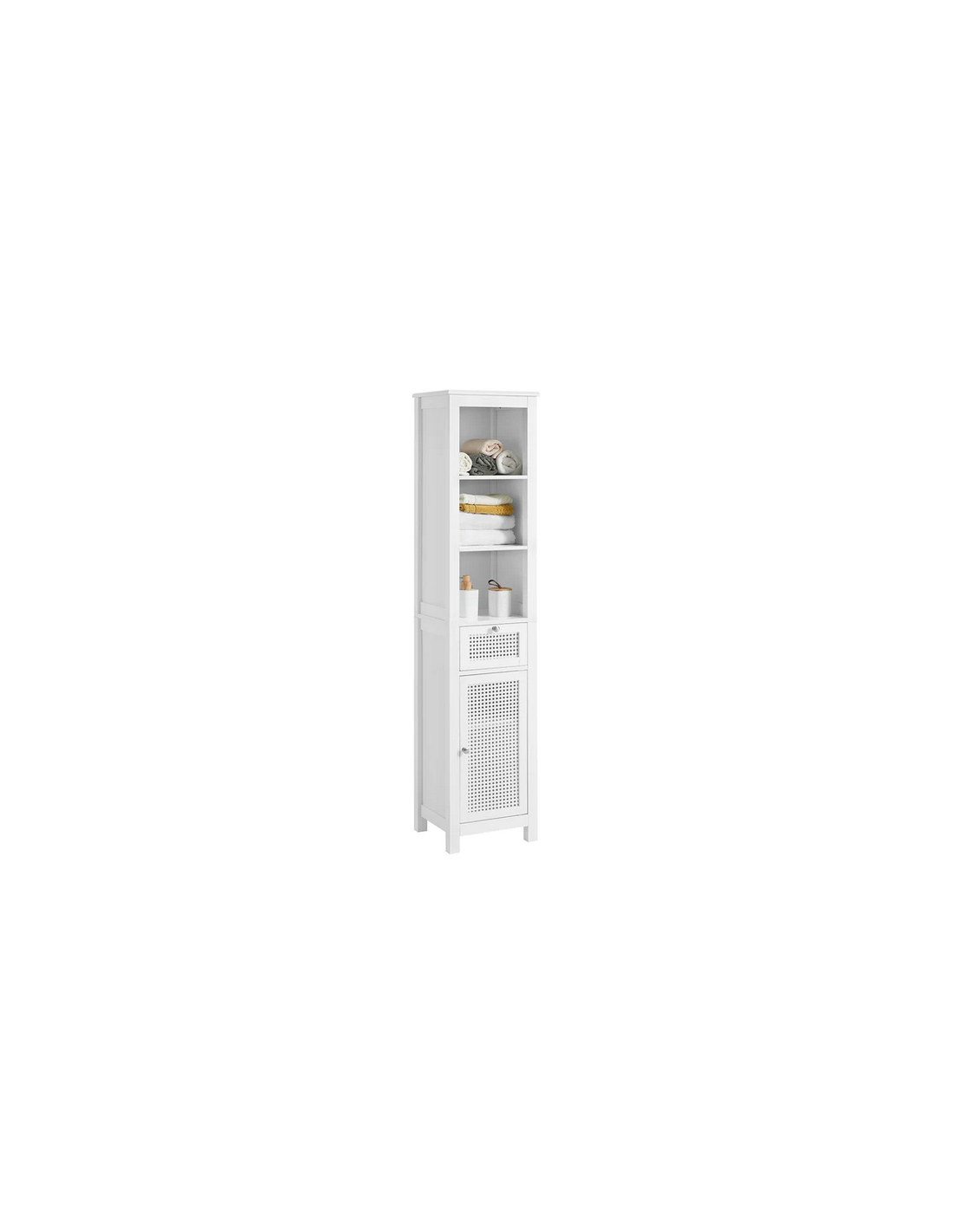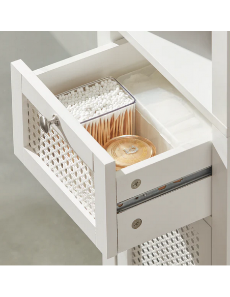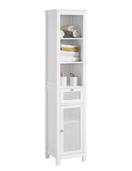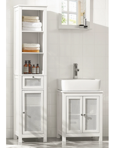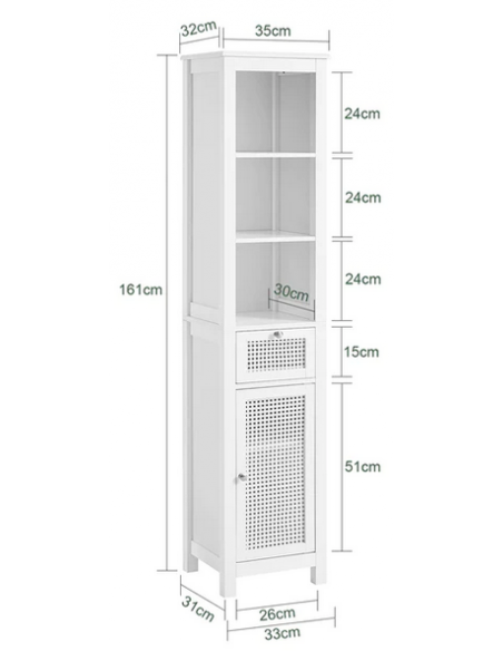Skab til badeværelset, udført i et design af hvid træ og mdf. Skabet måler 161 cm i højden og 35 x 32 cm i bredde og dybde.