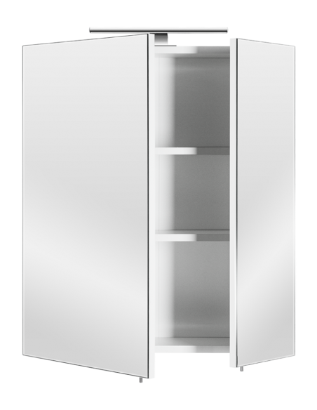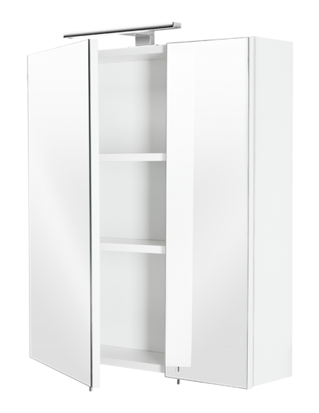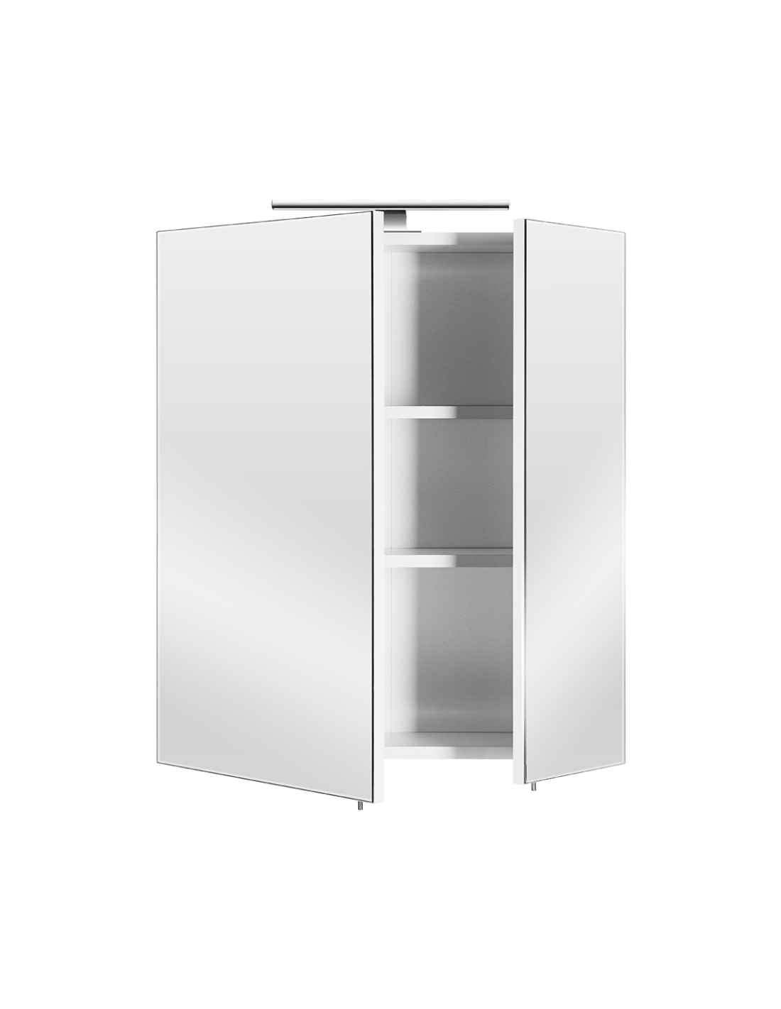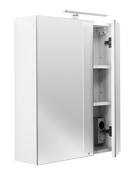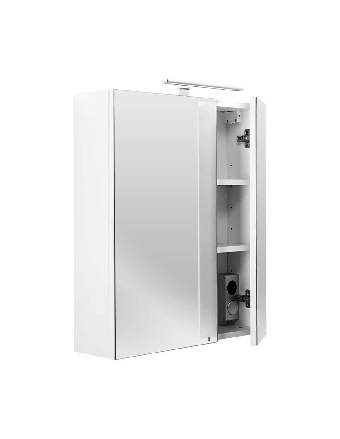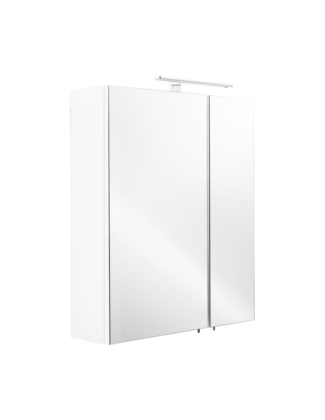 Spejlskab med 5W LED lampe, udført i et design af mdf og glas. Spejlskabet måler 68 cm i højden og 60 x 16 cm i bredde og dybde. I skabet forefindes 6 hylderum og 1 stikdåse, som gør tilslutning af eksempelvis barbermaskine lettere.