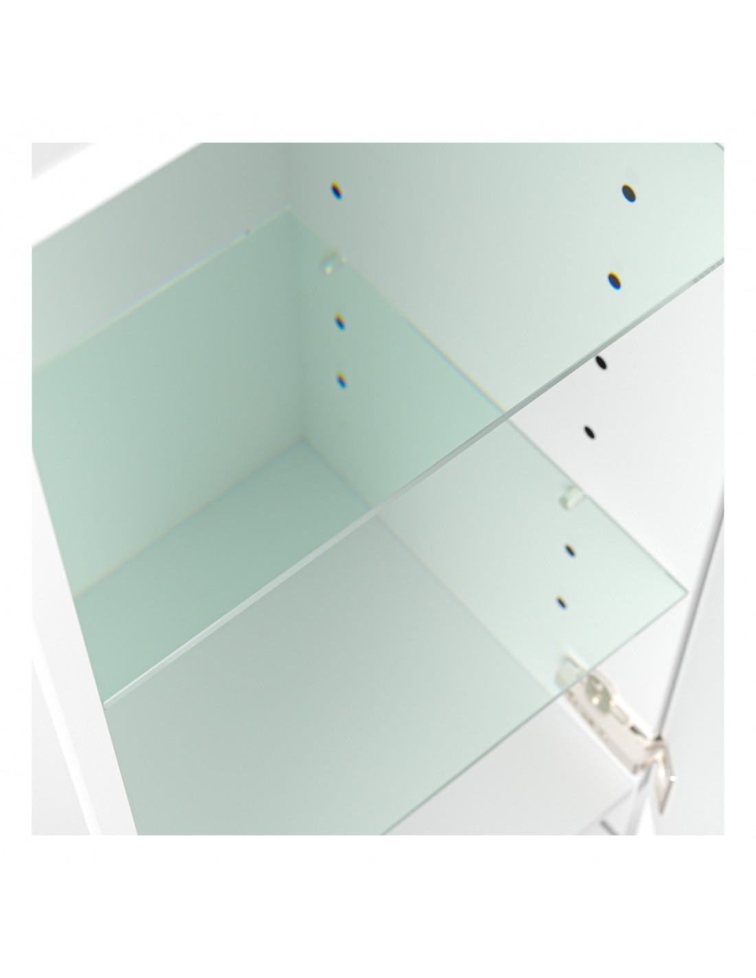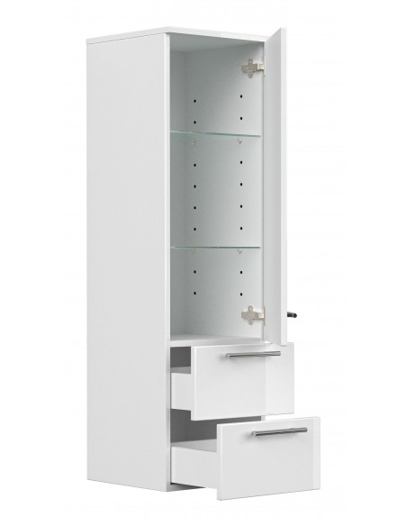 Vægskab udført i et design af mdf. Skabet måler 120 cm i højden og 35,2 x 35,8 cm i bredde og dybde. I skabet forefindes 2 glashylder og 2 skuffer.
