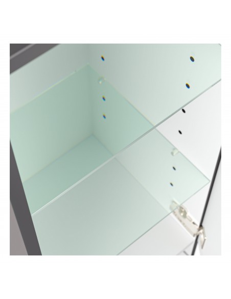 Vægskab udført i et design af mdf. Skabet måler 120 cm i højden og 35,2 x 35,8 cm i bredde og dybde. I skabet forefindes 2 glashylder og 2 skuffer.