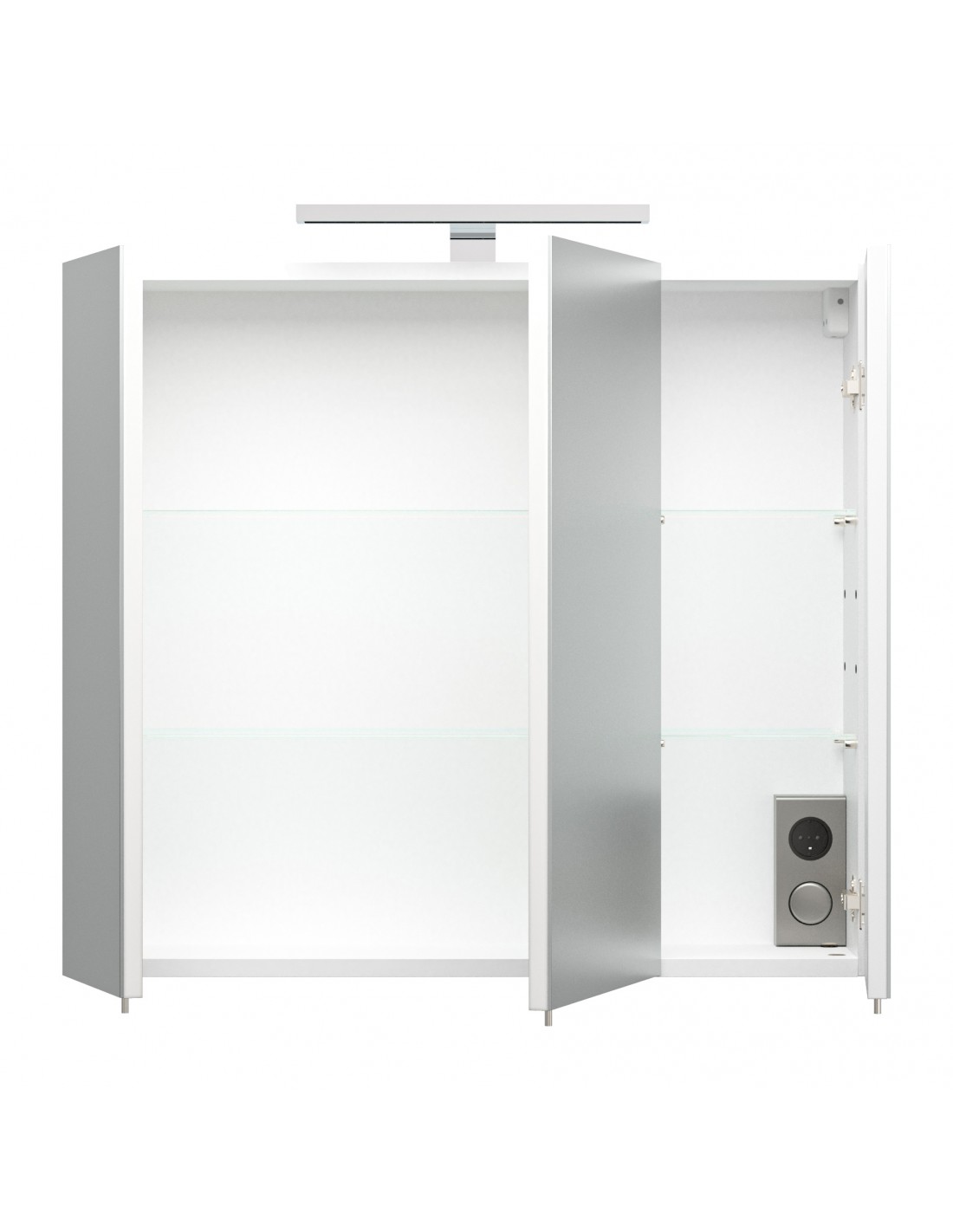 Spejlskab med 5W LED lampe, udført i et design af mdf og glas. Spejlskabet måler 62 cm i højden og 70 x 17 cm i bredde og dybde. I skabet forefindes 4 glashylder og 1 stikdåse, som gør tilslutning af eksempelvis barbermaskine lettere.