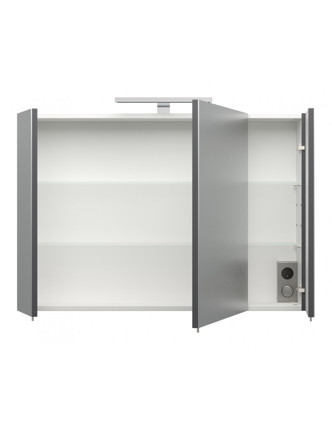 Spejlskab med 5W LED lampe, udført i et design af mdf og glas. Spejlskabet måler 62 cm i højden og 90 x 17 cm i bredde og dybde. I skabet forefindes 4 glashylder og 1 stikdåse, som gør tilslutning af eksempelvis barbermaskine lettere.