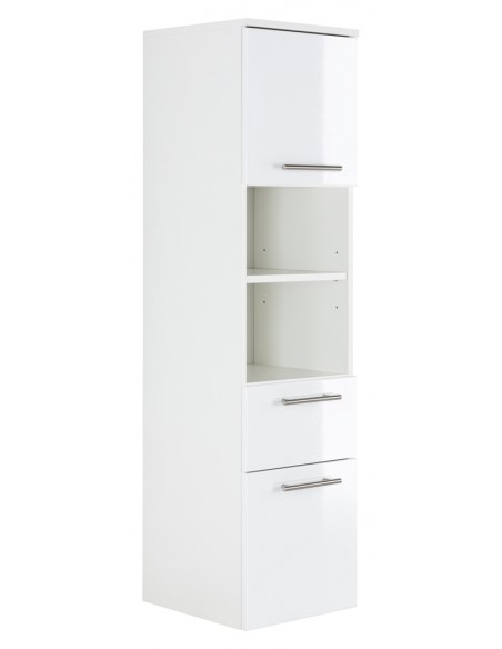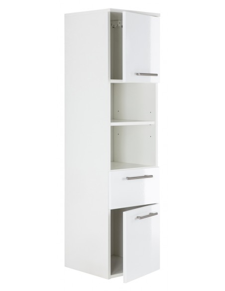 Vægskab udført i et design af mdf. Skabet måler 134,5 cm i højden og 35,2 x 36,8 cm i bredde og dybde. I skabet forefindes 1 skuffe, 2 åbne hylderum og 2 skabsrum.