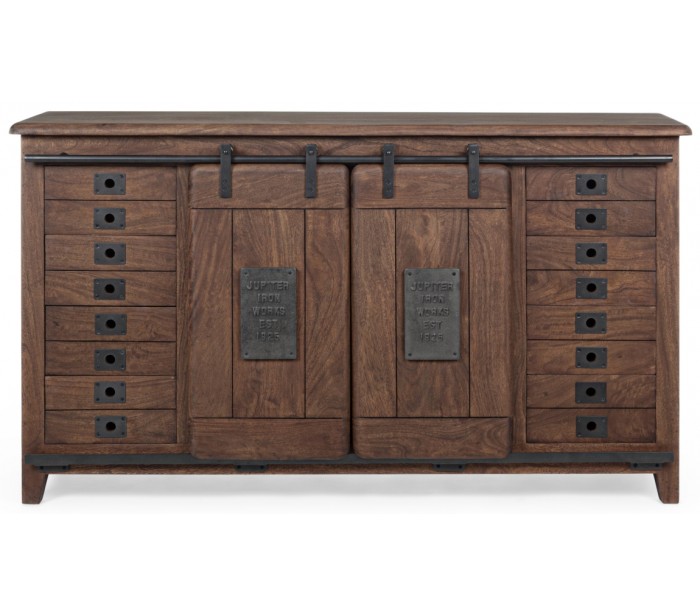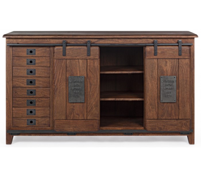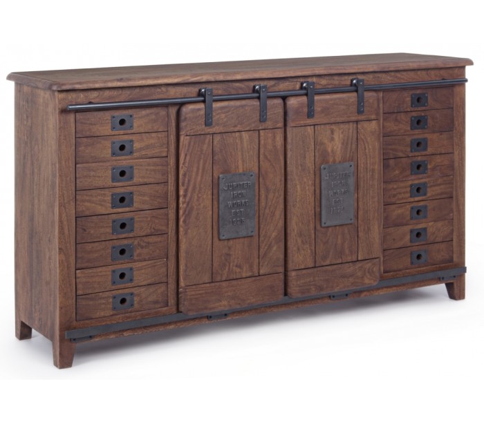 Sideboard i et rustikt design, fremstillet i mangotræ og jern. Der er i skabet 2 skabe med skydelåger og 8 skuffer, der giver optimal opbevaringsmulighed. Sideboardet måler 94 cm i højden og 168 x 43 cm i bredde og dybde.
