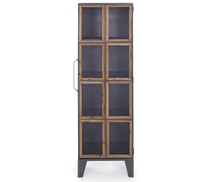 Skab i et industrielt design, fremstillet med kabinet i stål og detaljer i fyrretræ og glas. Skabet indeholder 1 låge der gemmer på 4 hylderum. Bemærk venligst, at ujævnheder kan forekomme som en del af det industrielle. Skabet måler 138,5 cm i højden og 41 x 33,5 cm i bredde og dybde.