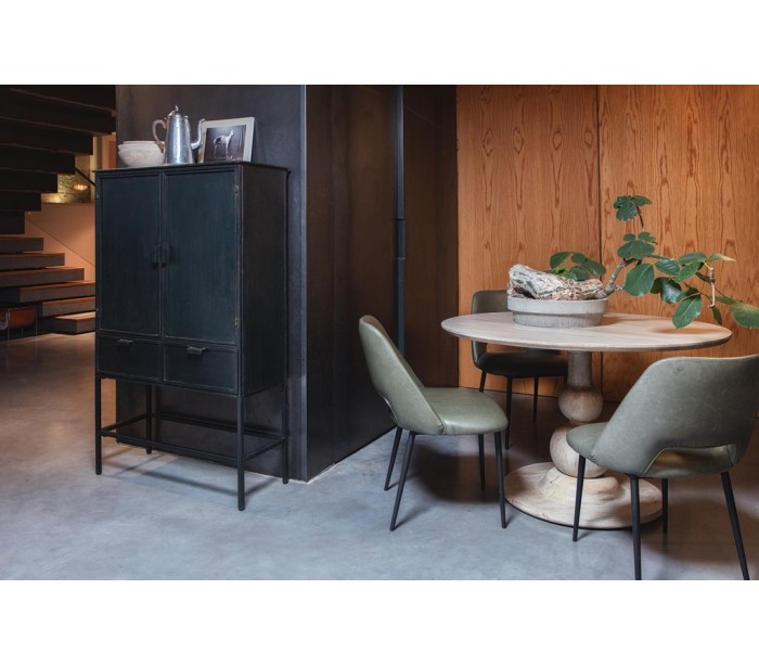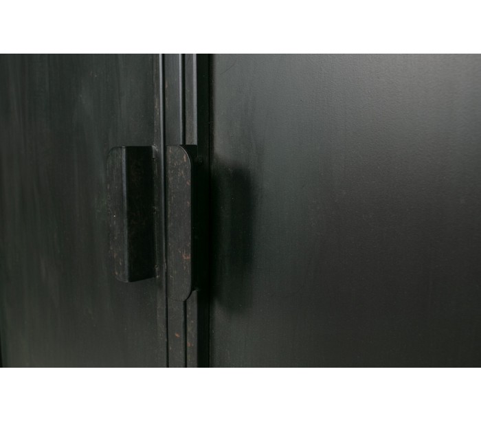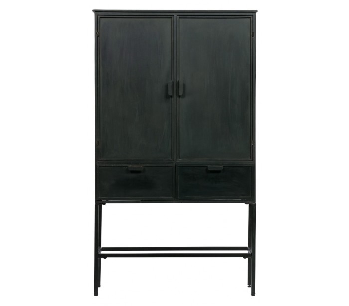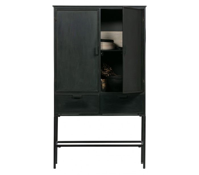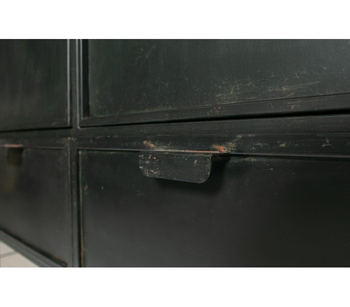 Vitrineskab i et industrielt design, fremstillet i antik sortlakeret jern (bemærk venligst, at designet er lettere slidt i udseendet). Skabet indeholder 2 skabe hvert med 2 hylderum. Dertil 2 skuffer.
