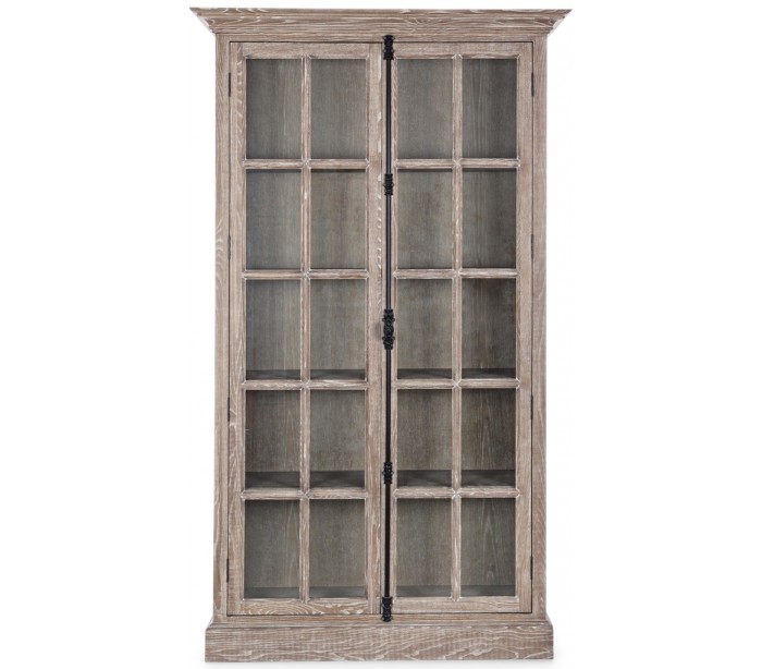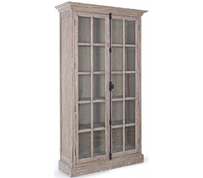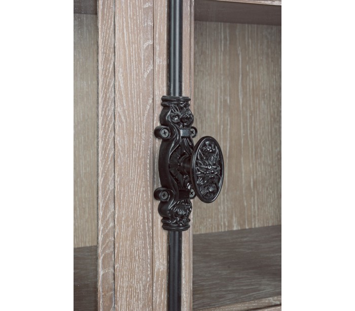 Vitrineskab i et rustikt design, fremstillet i ask træ, glas og metal. Der er i vitrineskabet i alt 5 brede hylderum. Vitrineskabet måler 210 cm i højden og 120 x 42 cm i bredde og dybde.