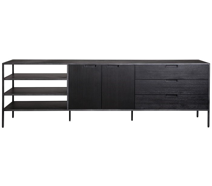 Sideboard i et moderne design, fremstillet i sortlakeret metal og sortlakeret akacietræ. Sideboardet måler 70 cm i højden og 220 x 42 cm i bredde og dybde. Sideboardet indeholder 3 hylderum, 2 skabe og 3 skuffer.