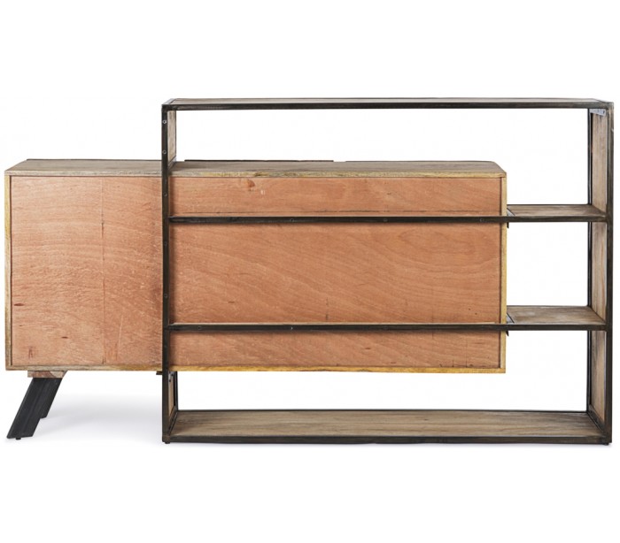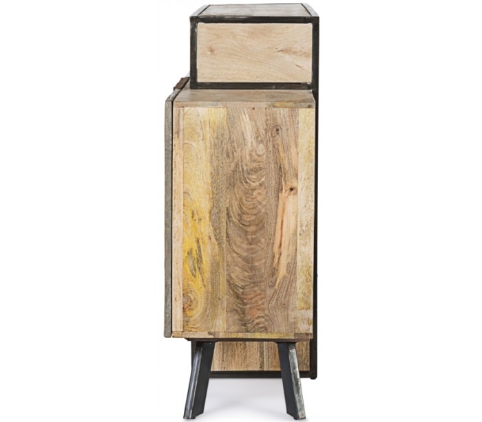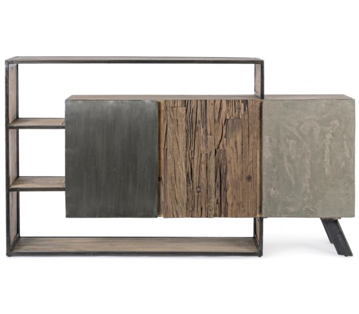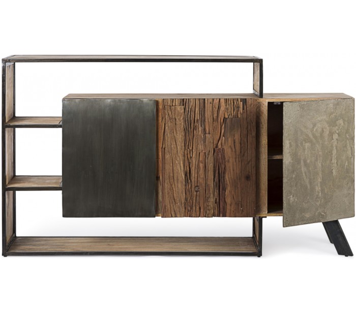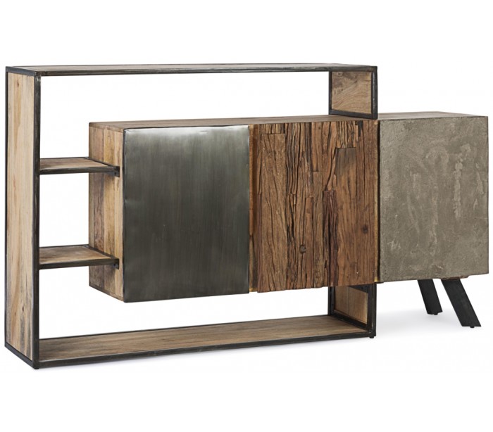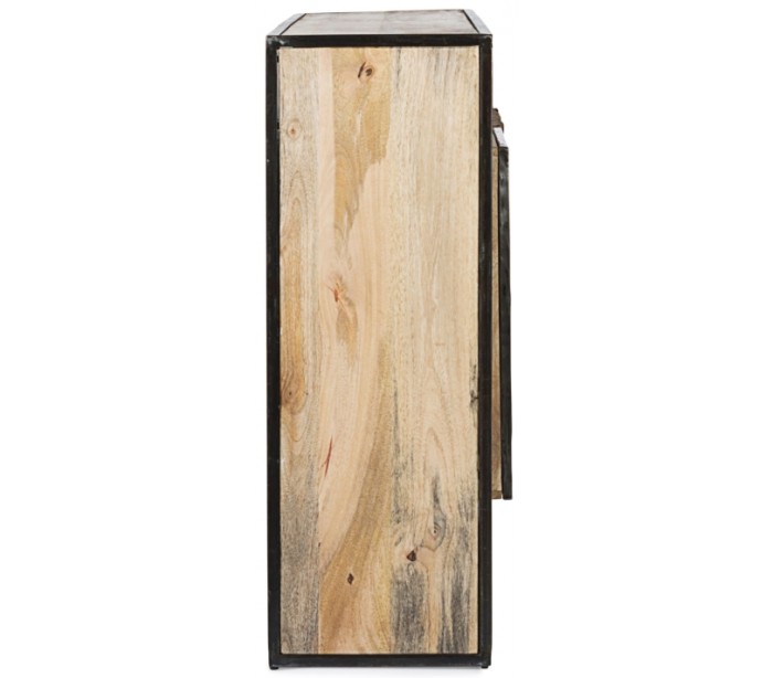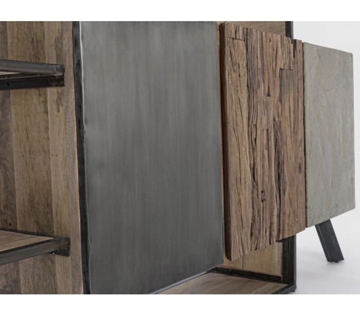 Sideboard i et rustikt design, fremstillet i mangotræ med skabsfronter i træ, fibercement og stål. Sideboardet måler 100 cm i højden og 175 cm i bredde og 38 cm i dybde. I skabene forefindes 1 hylde.