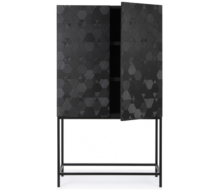 Vitrineskab i et rustikt design, fremstillet i rustik sortlakeret ask træ og stål. Vitrineskabet indeholder 2 hylder (3 hylderum) og måler 155 cm i højden og 90 cm i bredde og 40 cm i dybde. Bemærk venligst, at der er slidmærker rundt omkring, som en del af designet.