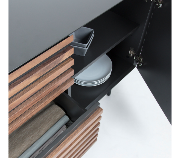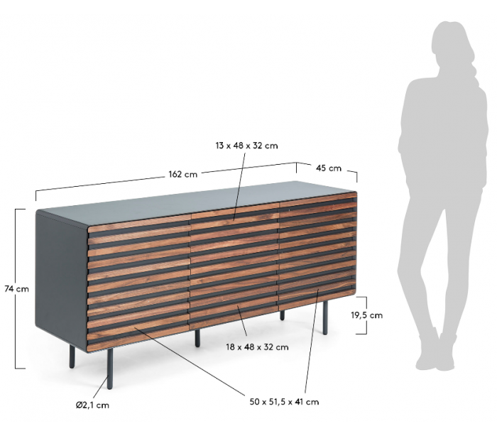 Sideboard med 2 skabe og 2 skuffer, udført i et skandinavisk design fra LaForma. Sideboardet er fremstillet i mdf og valnødde finér og måler 162 cm i bredden og 74 cm i højden.