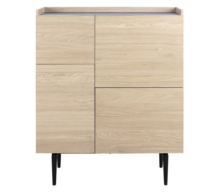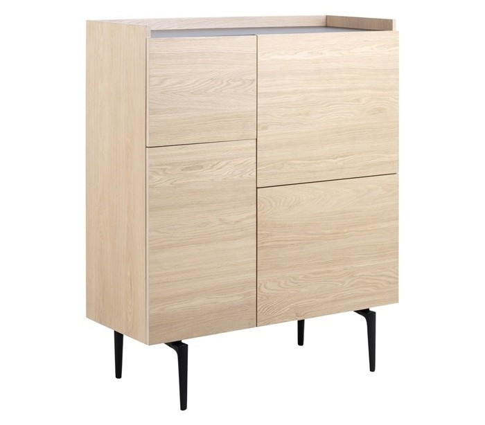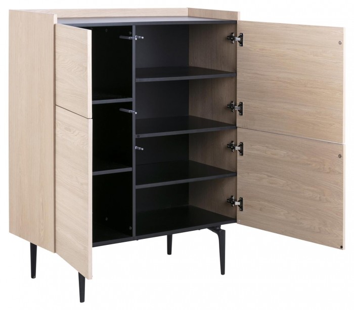 Highboard udført i et design af egetræsfinér og sortlakeret stål. Møblet måler 100 cm i bredden og 121 cm i højden og indeholder 7 hylderum.