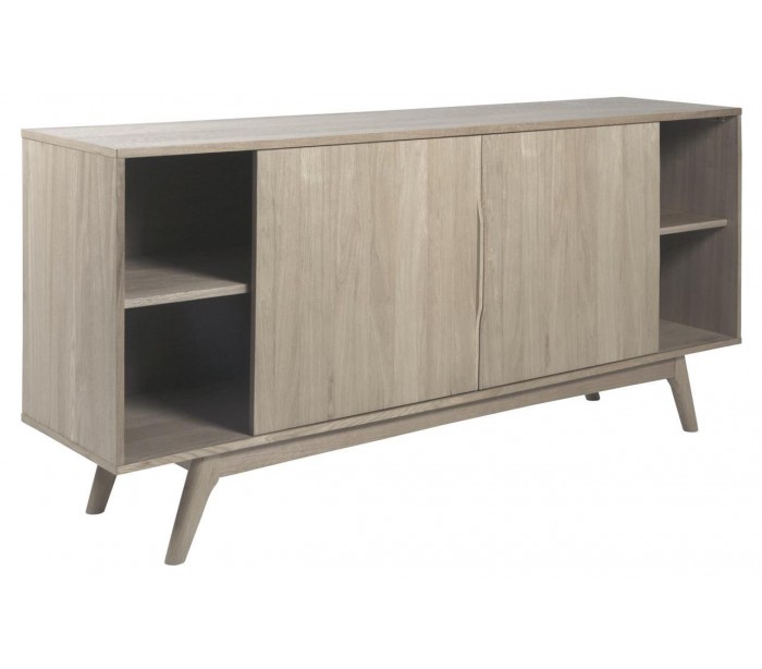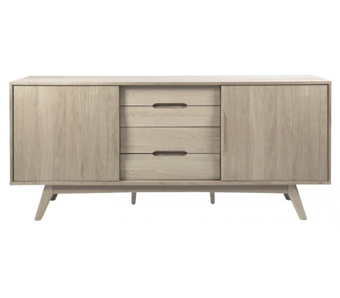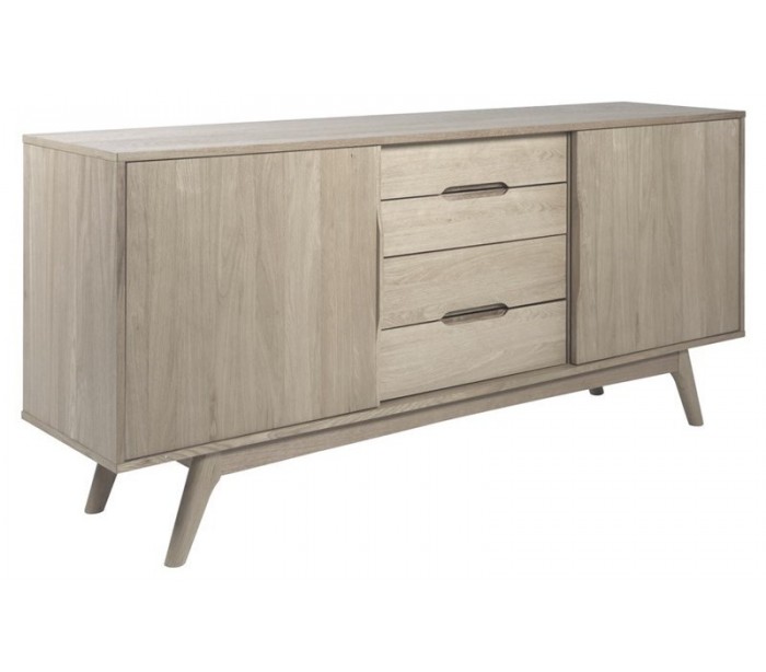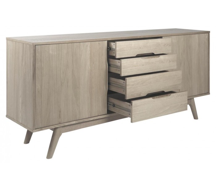 Sideboard udført i et design af massiv hvidpigmenteret egetræ og egetræsfinér. Møblet måler 180 cm i bredden og 84 cm i højden og indeholder 4 skuffer og i alt 4 hylderum, gemt bag 2 skydelåger.