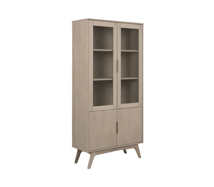 Vitrineskab udført i et design af massiv hvidpigmenteret egetræ og egetræsfinér og med glasruder. Møblet måler 94 cm i bredden og 192 cm i højden og indeholder 5 hylderum, gemt bag 4 skabslåger.