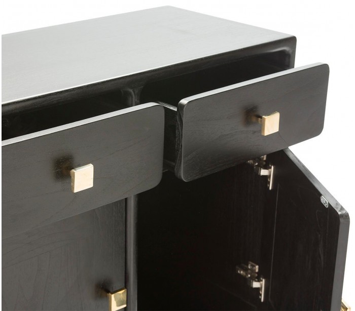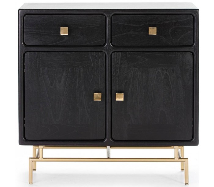 Sideboard udført i et let moderne, men rustikt design i antik guldfarvet metal og sortlakeret træ. Sideboardet indeholder 2 skabe og 2 skuffer og måler 90 cm i bredden og 90 cm i højden.