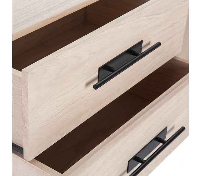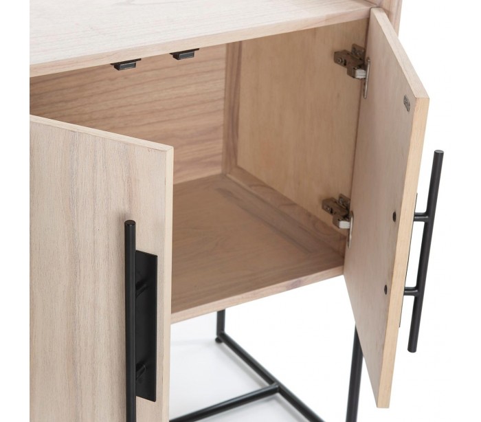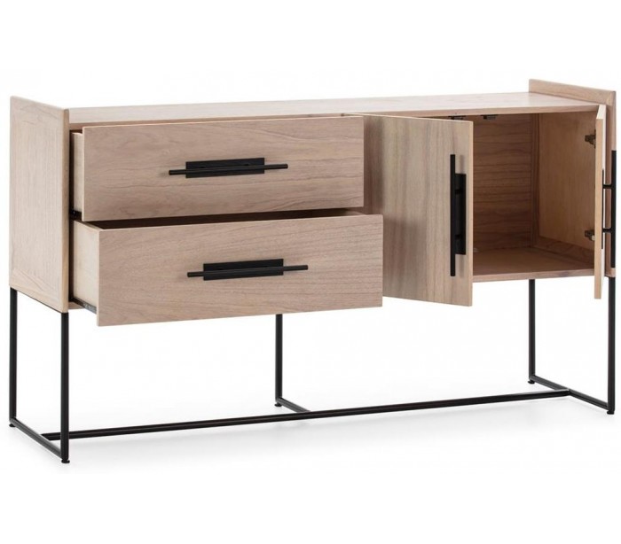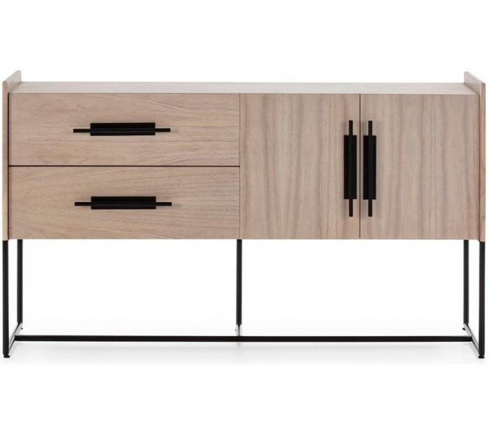 Sideboard udført i et design af naturfarvet træ og med stel i sortlakeret metal. Grebene er udført i sortlakeret metal. Sideboardet kommer med 2 hylderum samt 1 dobbeltskab med hylderum. Sideboardet måler 150 cm i bredden og 86 cm i højden.