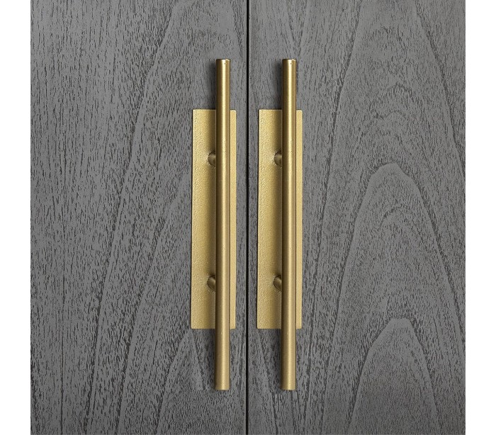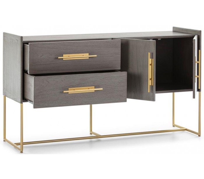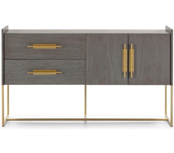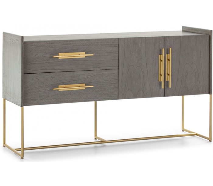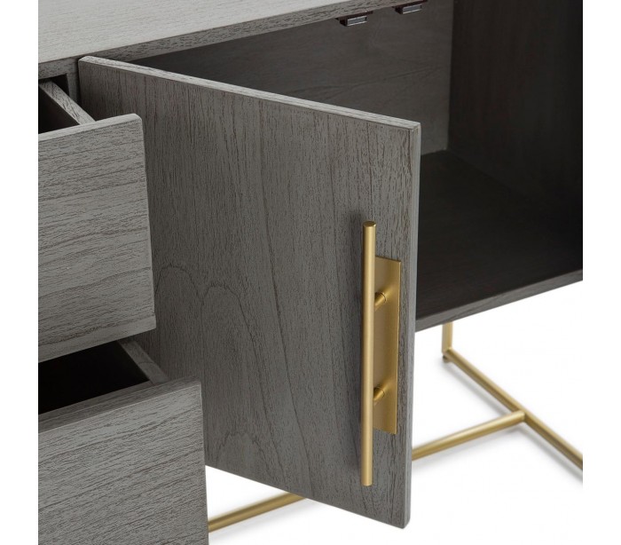 Sideboard udført i et design af grålakeret træ og med stel i antik guldfarvet metal. Grebene er udført i antik guldfarvet metal. Sideboardet kommer med 2 hylderum samt 1 dobbeltskab med hylderum. Sideboardet måler 150 cm i bredden og 86 cm i højden.