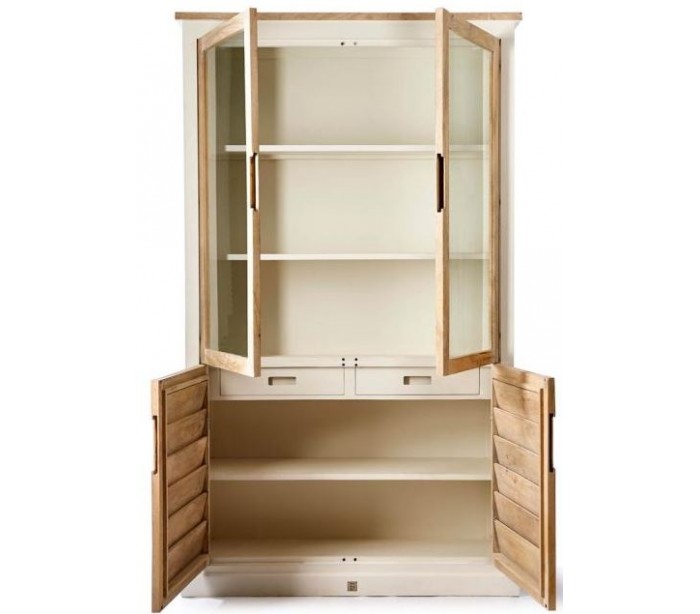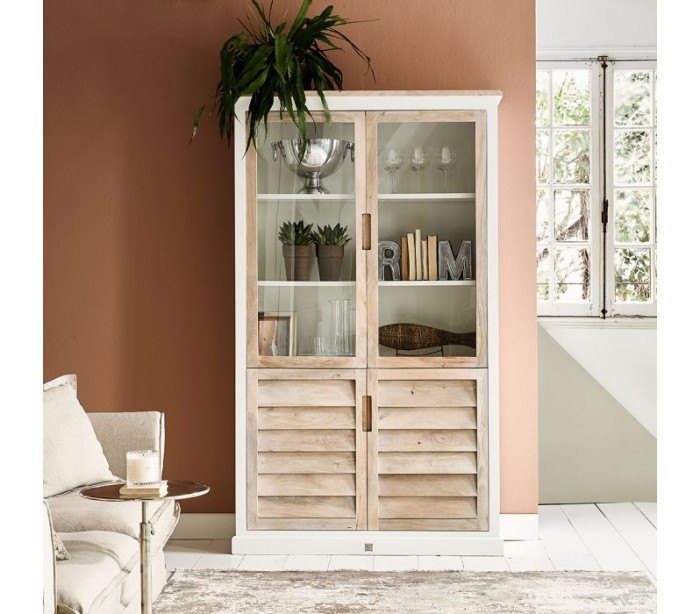 Riviera Maison vitrineskab i et rustikt design af mangotræ. Skabet indeholder i alt 4 skabslåger, der i alt gemmer på 5 hylderum og 2 skuffer og måler 210 cm i højden og 124 cm i bredden.