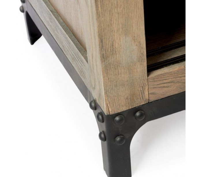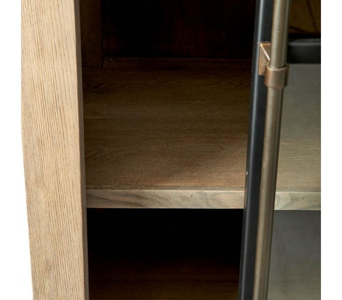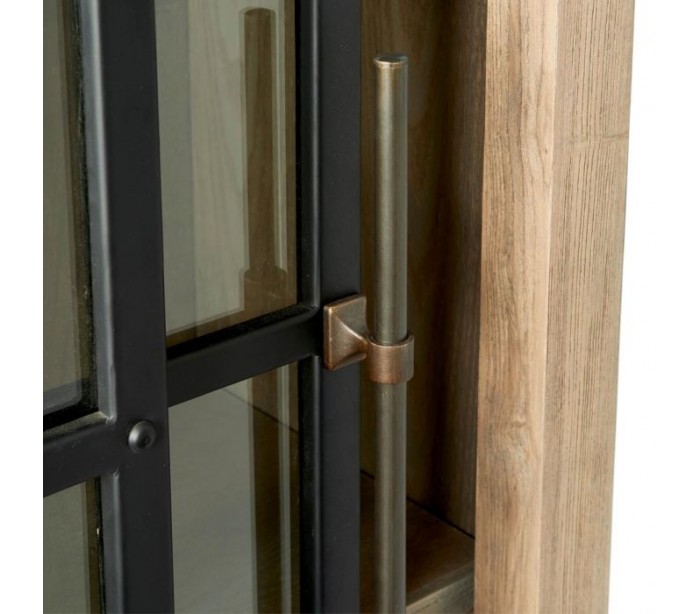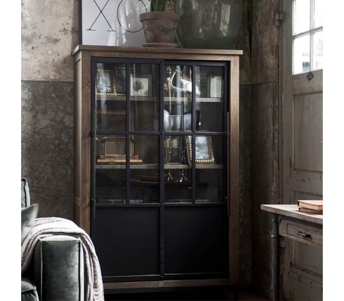 Riviera Maison vitrineskab i et industrielt design af genanvendt asktræ, industrielt sortlakeret jern og klart glas. Skabet indeholder 5 hylderum og måler 170 cm i højden og 110 cm i bredden. Bemærk venligst, at mindre ujævnheder kán forekomme som en del af designet.