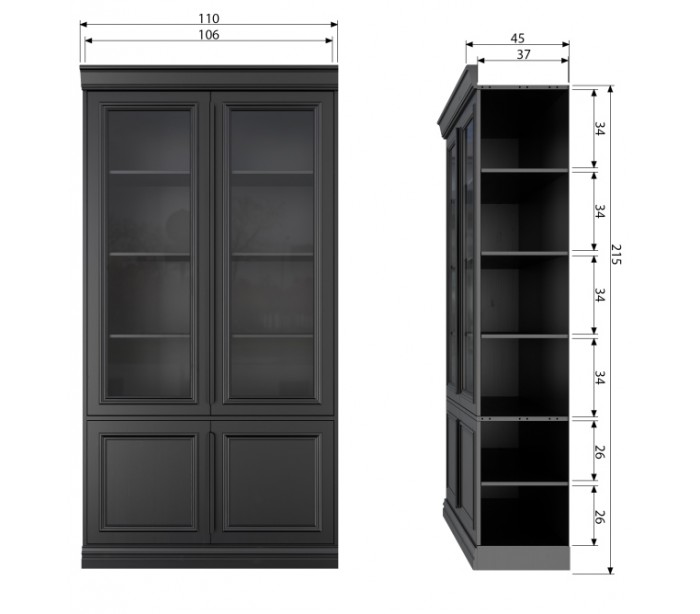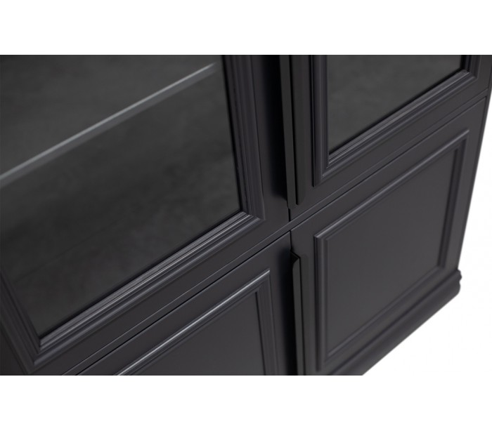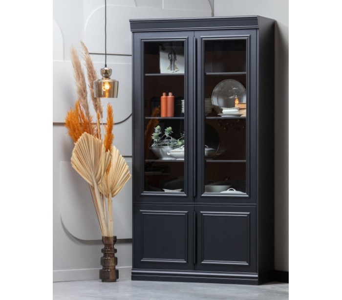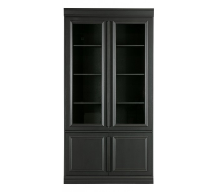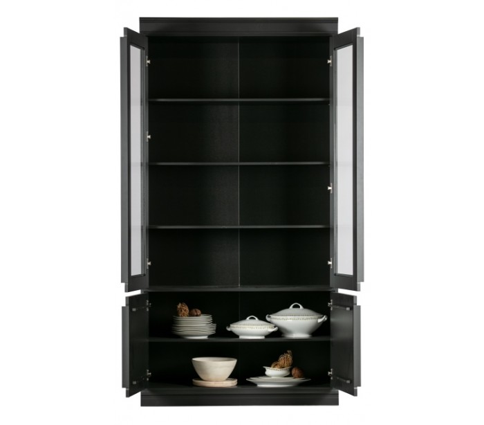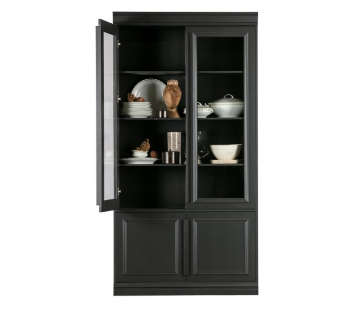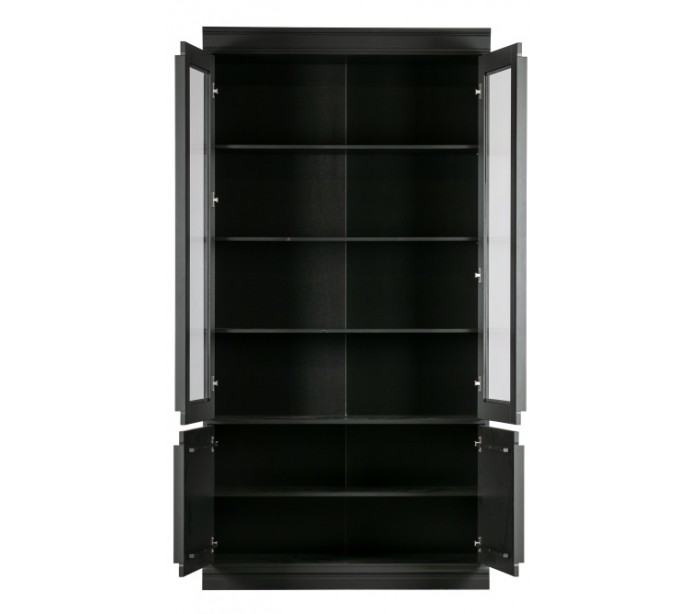 Vitrineskab i et moderne design, fremstillet i sortlakeret fyrretræ. Skabet indeholder 2 underskabe med tværgående hylder, samt 2 overskabe med tværgående hylder. Skabet måler 215 cm i højden og 110 x 44 cm i bredde og dybde.