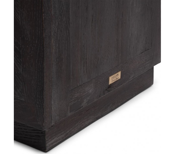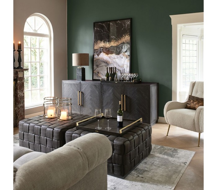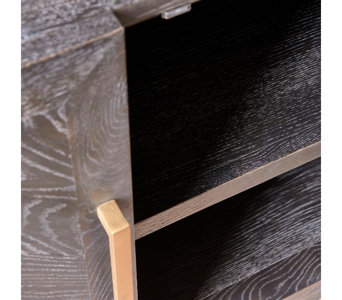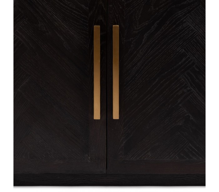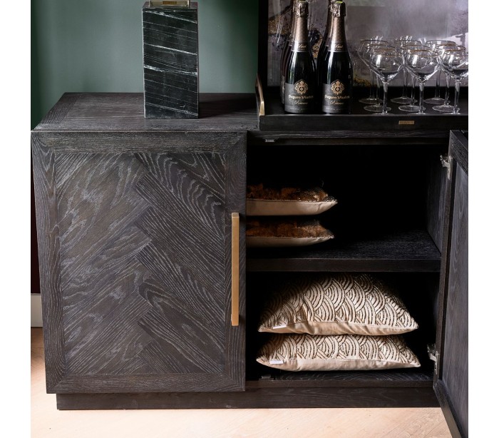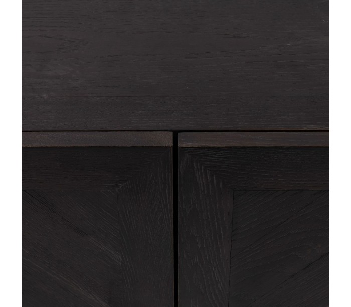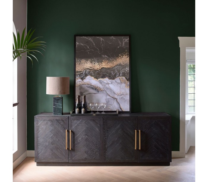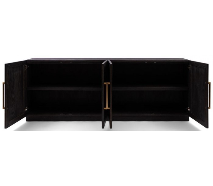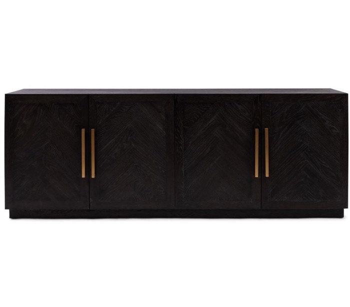 Riviera Maison sideboard i et design af sortbrun bejset genanvendt egetræ og med hængsler i messinglakeret stål. Sideboardet indeholder i alt 4 skabslåger der i alt gemmer på 4 hylderum og måler 85 cm i højden og 230 cm i bredden.