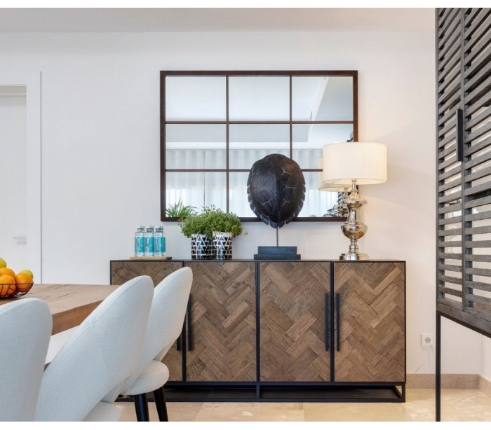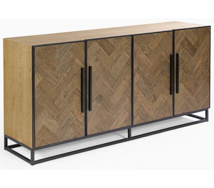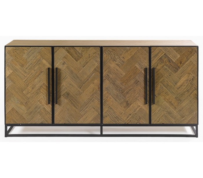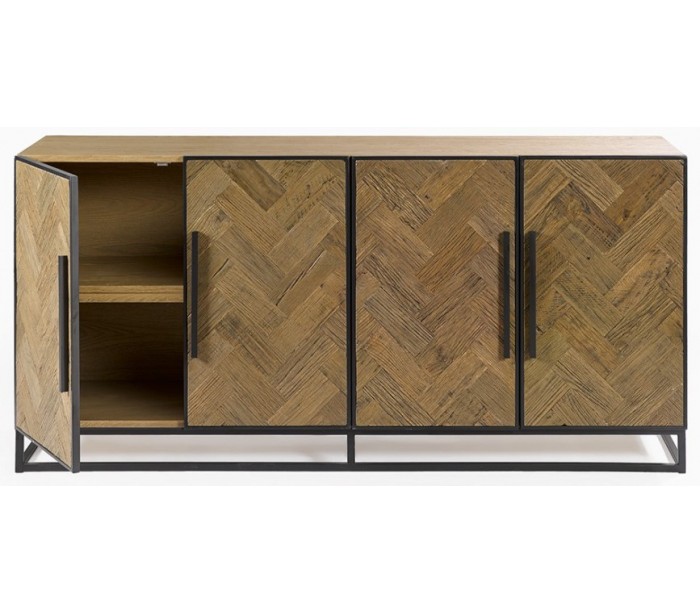 Sideboard udført i et rustikt design i genanvendt egetræ og sortlakeret metal. Sideboardet er med 4 skabslåger, der gemmer på i alt 4 hylderum. Møblet måler 180 cm i bredden og 86 cm i højden.