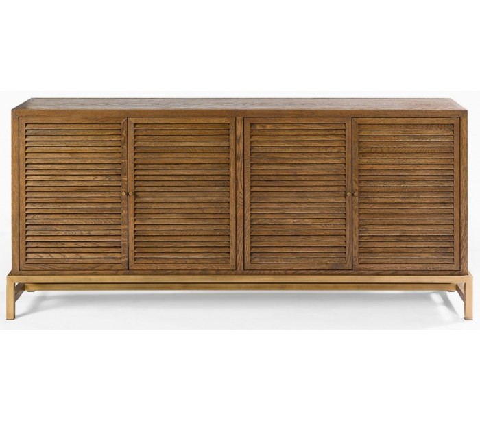 Sideboard udført i et rustikt design i brunbejset genanvendt egetræ og antik guldfarver metal, og med sider i klart glas. Sideboardet er med 4 skabslåger, der gemmer på i alt 4 hylderum. Møblet måler 190 cm i bredden og 86 cm i højden.