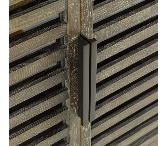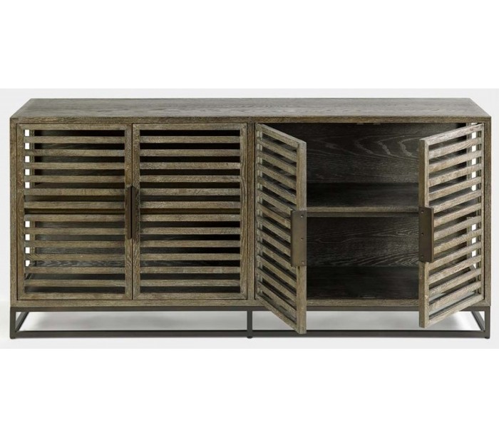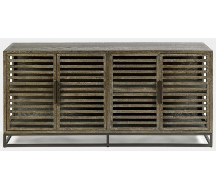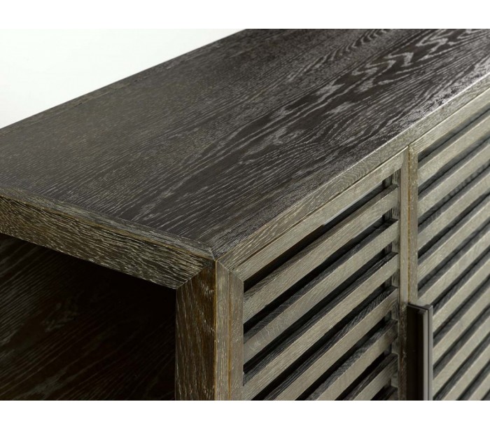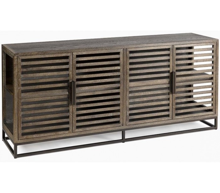Sideboard udført i et rustikt design i gråbejset egetræ og antik sortlakeret metal, og med sider i klart glas. Sideboardet er med 4 skabslåger, der gemmer på i alt 4 hylderum. Møblet måler 180 cm i bredden og 86 cm i højden.