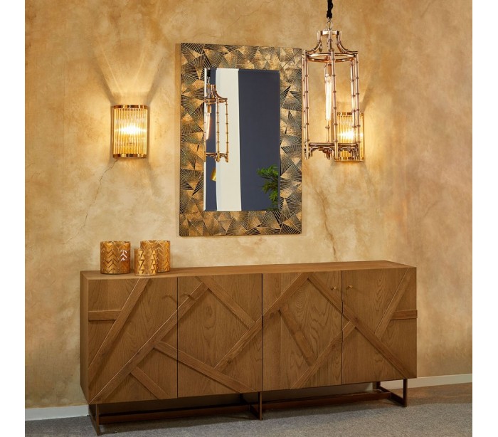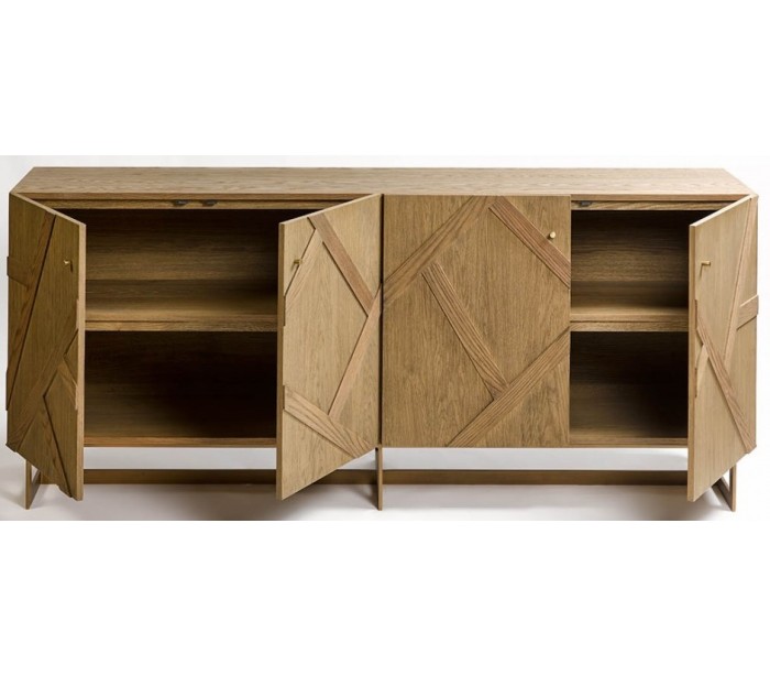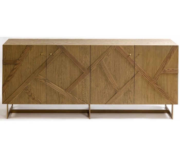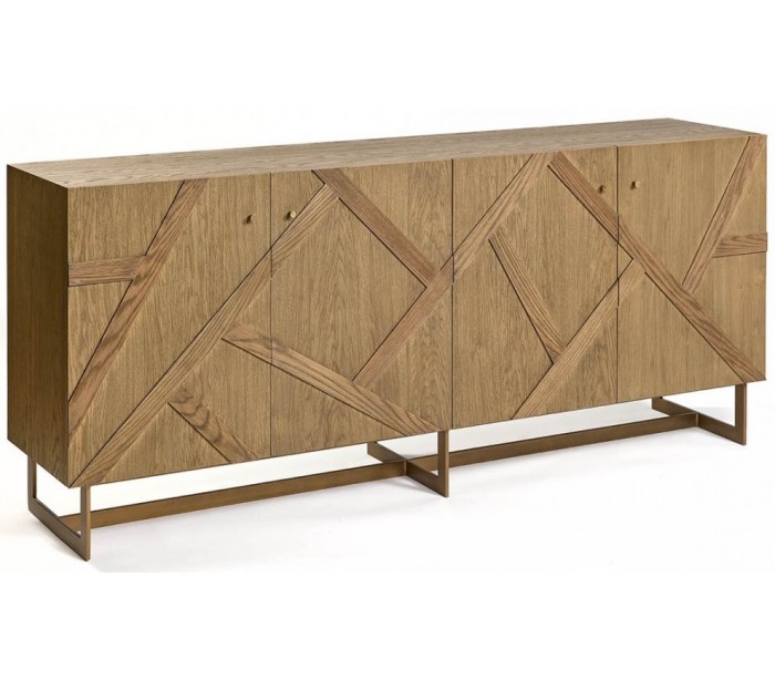 Sideboard udført i et rustikt design i antik guldfarvet metal og let olieret egetræ. Sideboardet er med 4 skabslåger, der i alt gemmer på 4 hylderum. Møblet måler 200 cm i bredden og 86 cm i højden.