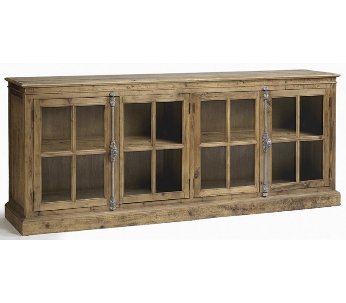 Sideboard udført i et antikt design i genanvendt fyrretræ og klart glas. Sideboardet er med 4 skabslåger, der i alt gemmer på 4 hylderum. Møblet måler 220 cm i bredden og 90 cm i højden.