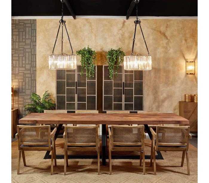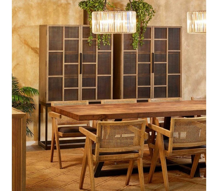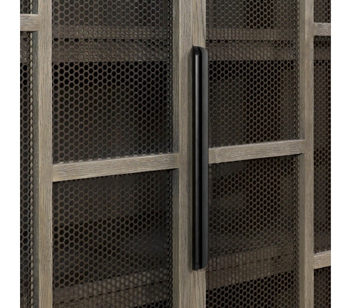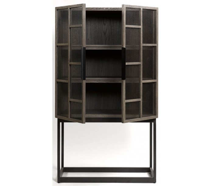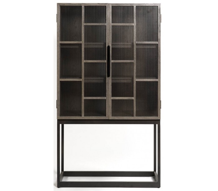 Vitrineskab udført i et rustikt design i gråbejset egetræ og antik sortlakeret metal med net i dørerne. Vitrineskabet er med 2 skabslåger, der gemmer på i alt 3 hylderum. Møblet måler 98 cm i bredden og 175 cm i højden.