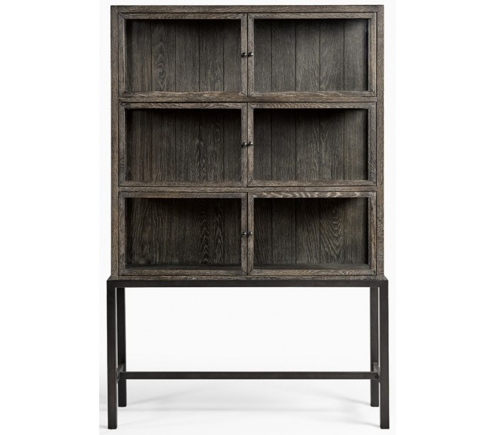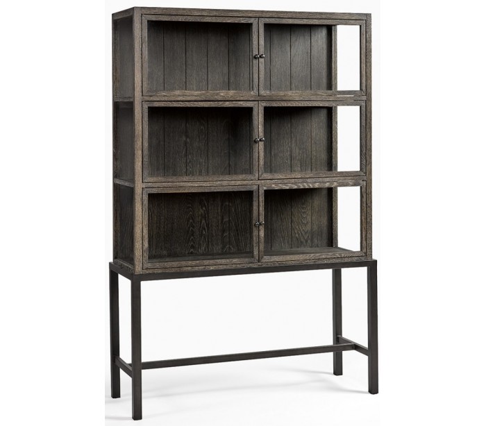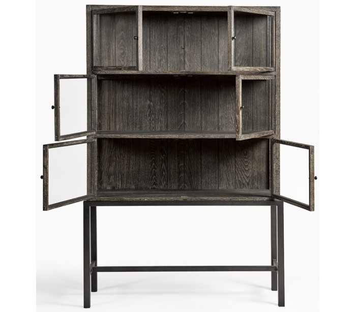 Vitrineskab udført i et design i gråbejset egetræ, antik sortlakeret metal og klart glas. Vitrineskabet er med 6 skabslåger, der gemmer på i alt 3 hylderum. Møblet måler 116 cm i bredden og 175 cm i højden.
