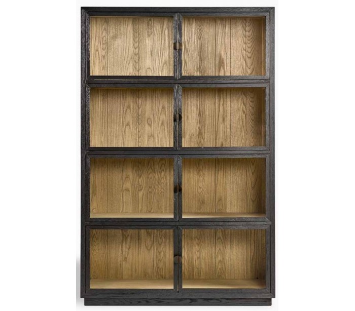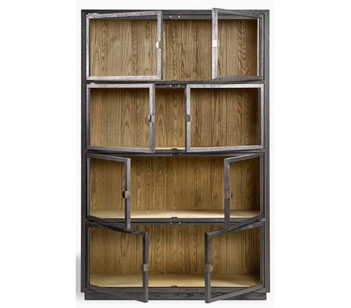Vitrineskab udført i et design i antik sortbejset egetræ og børstet eg med klart glas. Vitrineskabet er med 8 skabslåger, der gemmer på i alt 4 hylderum. Møblet måler 120 cm i bredden og 185 cm i højden.