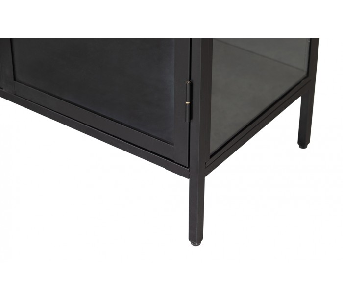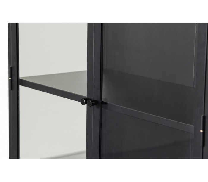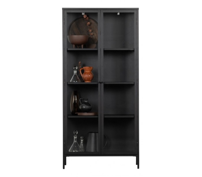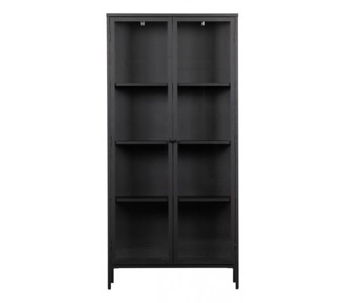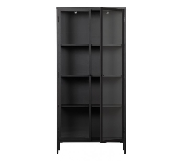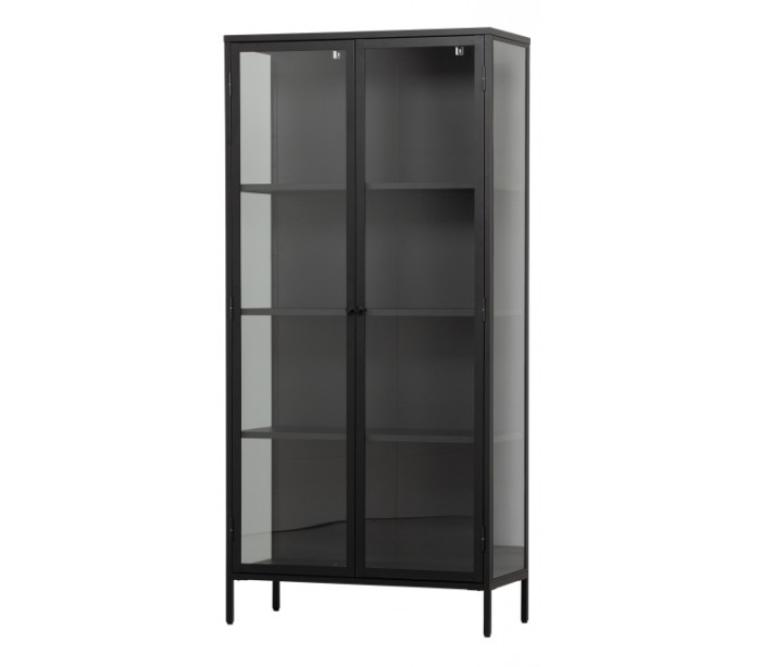 Vitrineskab udført i et design af sortlakeret stål og klart glas. Vitrineskabet måler 190 cm i højden og 90 x 43 cm i bredde og dybde. Skabet indeholder i alt 4 dobbelte hylderum.