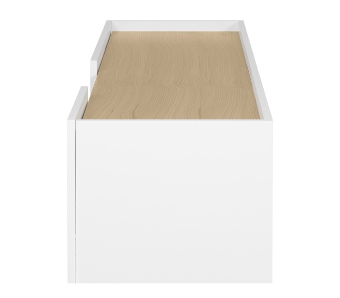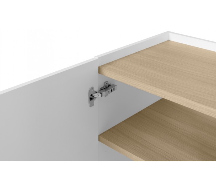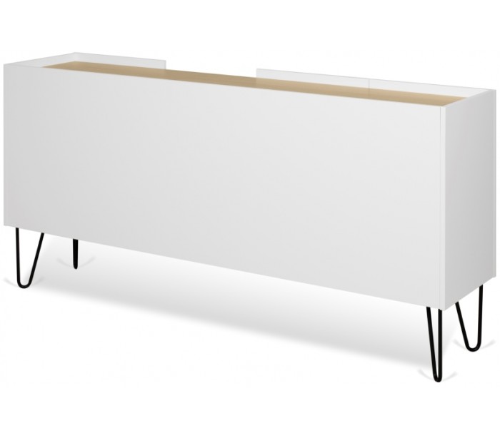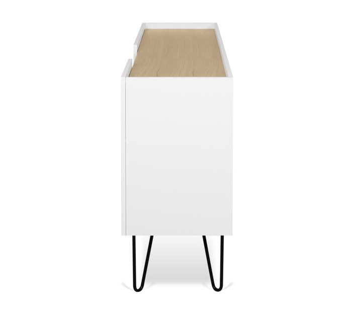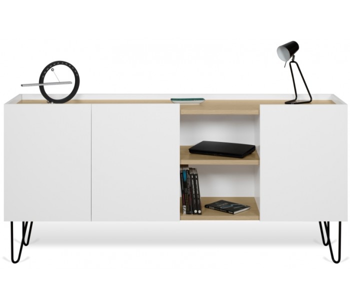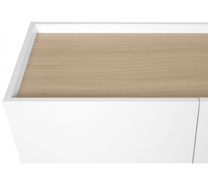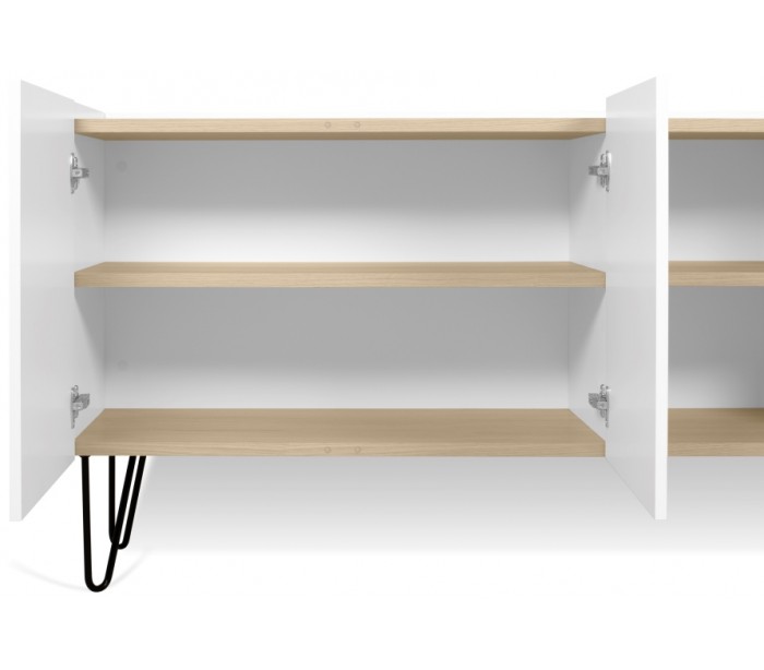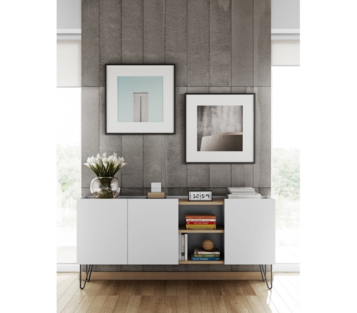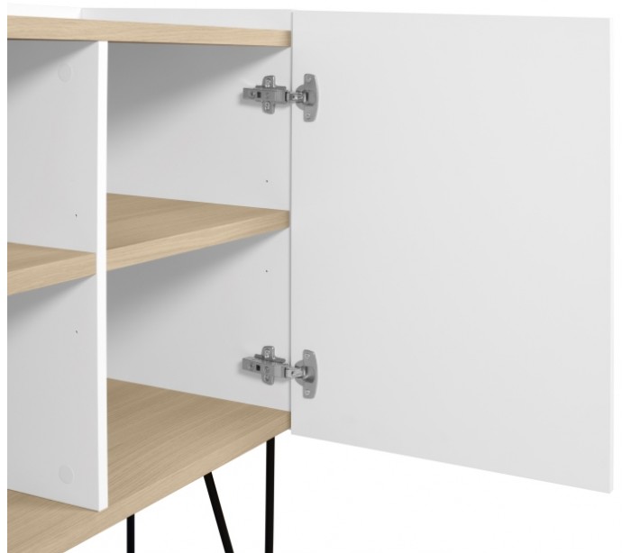 TemaHome Nina sideboard udført i et design af mat hvid og egetræsfinér med ben i sortlakeret metal. Sideboardet måler 83 cm i højden og 180 x 42 cm i bredde og dybde. Sideboardet indeholder 1 dobbeltskab med 2 hylderum samt 1 skab også med 2 hylderum. Hertil 2 åbne hylderum.