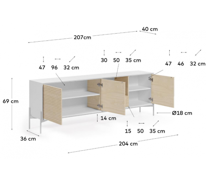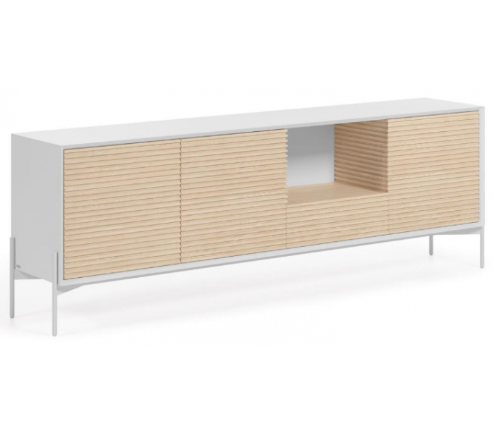 Sideboard med 3 skabe, 1 skuffe og 1 åbent hylderum, udført i et skandinavisk design fra LaForma. Sideboardet er fremstillet i mdf og askfinér og måler 207 cm i bredden.