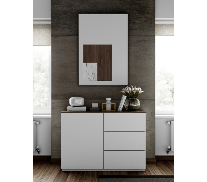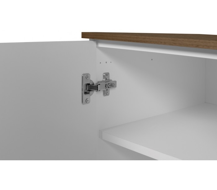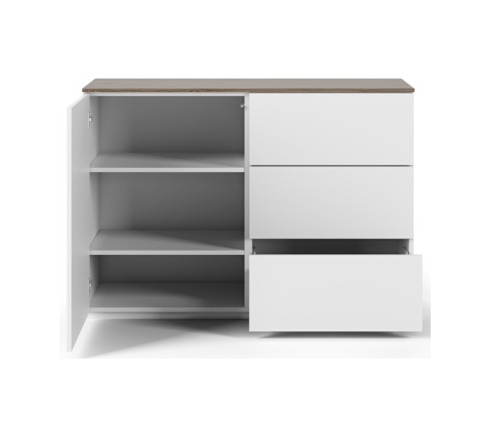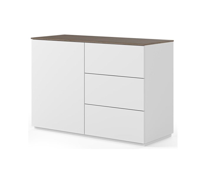 TemaHome Join sideboard udført i et design af mat hvid og valnøddefarvet mdf og finér. Sideboardet måler 84 cm i højden og 120 x 50 cm i bredde og dybde. Sideboardet indeholder 3 skuffer samt 1 skab med 3 hylderum.