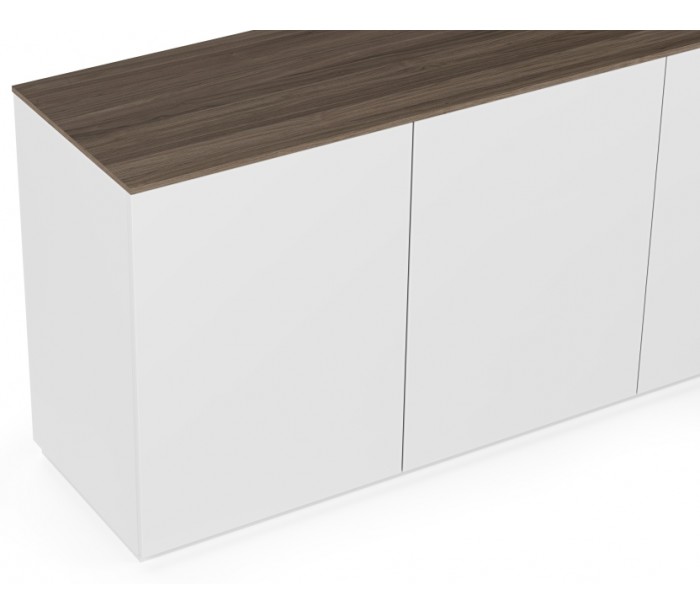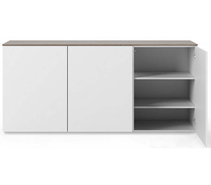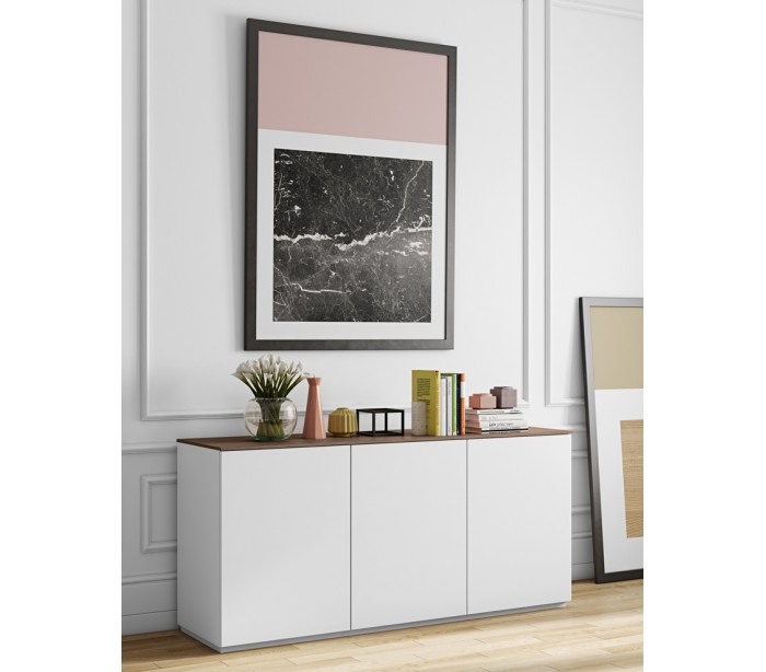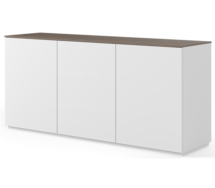TemaHome Join sideboard udført i et design af mat hvid og valnøddefarvet mdf og finér. Sideboardet måler 84 cm i højden og 180 x 50 cm i bredde og dybde. Sideboardet indeholder 3 skabe, hvert med 3 hylderum.