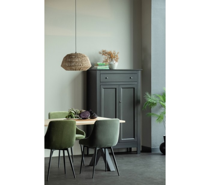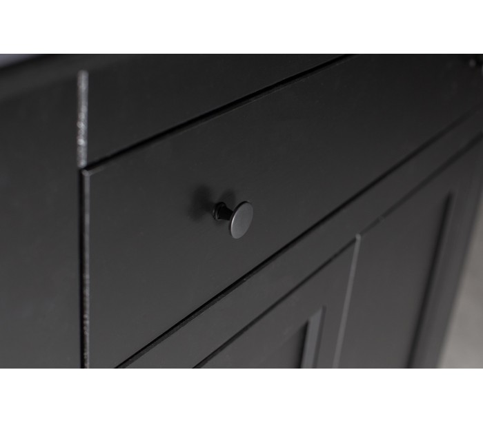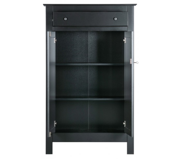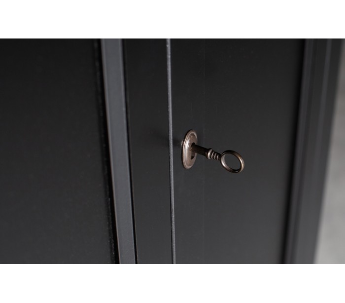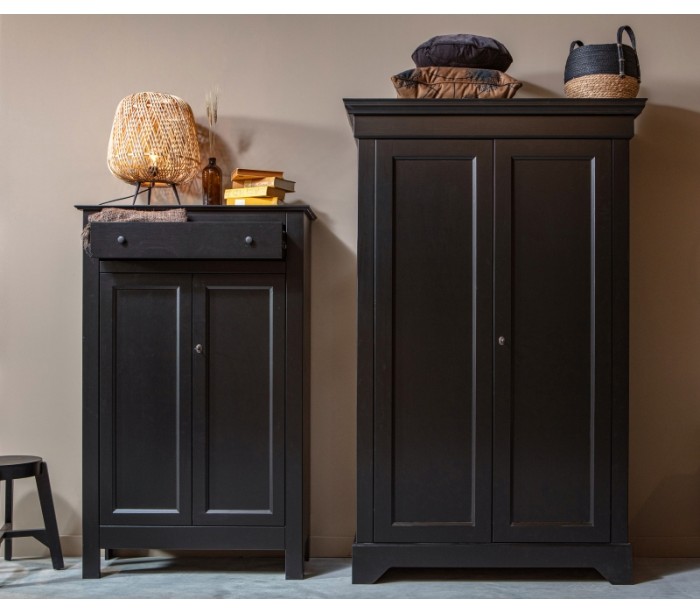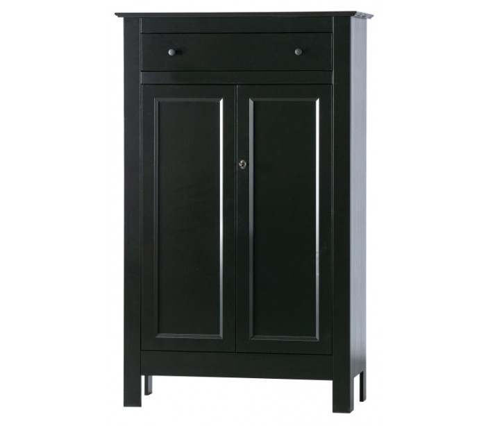 Kabinet i et moderne design, fremstillet i sortlakeret fyrretræ. Kabinettet indeholder 2 skabe med 2 tværgående hylder, samt skuffe. Kabinettet måler 150 cm i højden og 93 x 40 cm i bredde og dybde.