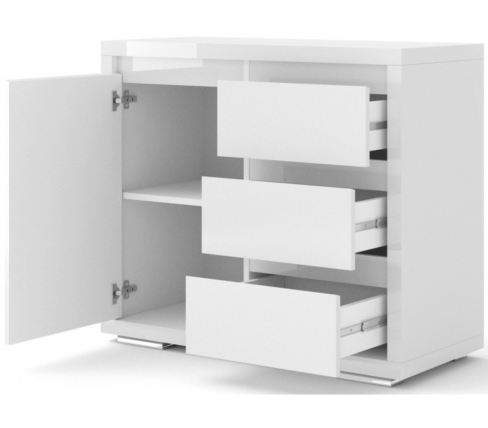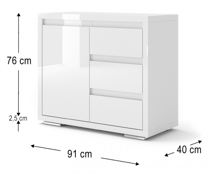 Nordic sideboard udført i et design af hvid højglans mdf og finér. Sideboardet måler 76 cm i højden og 91 x 40 cm i bredde og dybde. Sideboardet indeholder 3 skuffer samt 1 skab med i alt 2 hylderum.