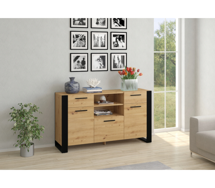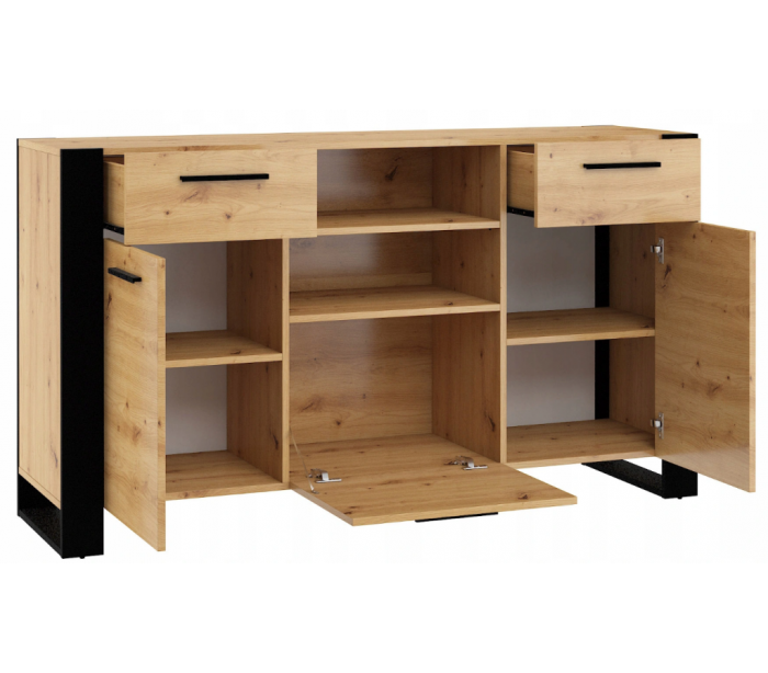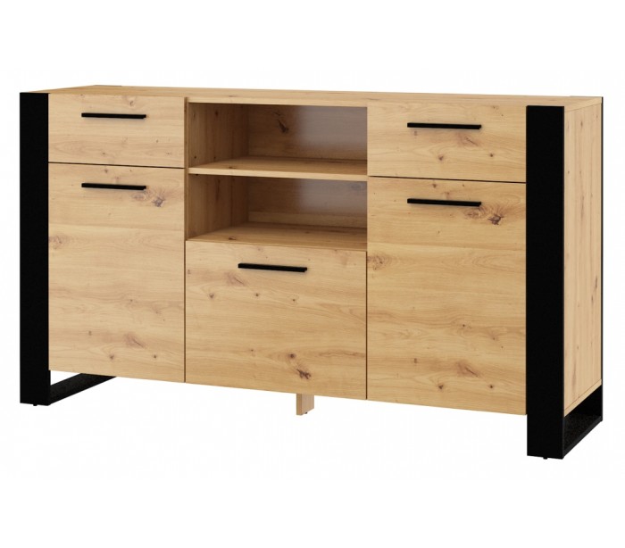 Nuka sideboard udført i et design af sort og vild egetræsfarvet møbelplade. Sideboardet måler 87 cm i højden og 155 x 45 cm i bredde og dybde. Sideboardet indeholder 2 skuffer samt 3 skabe, med i alt 5 hylderum. Hertil 2 åbne hylderum.