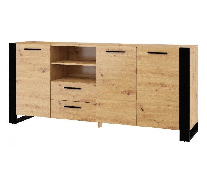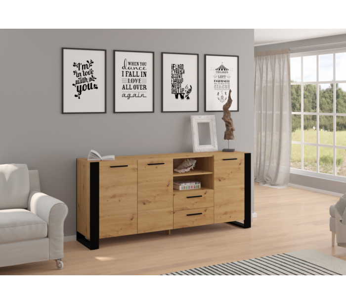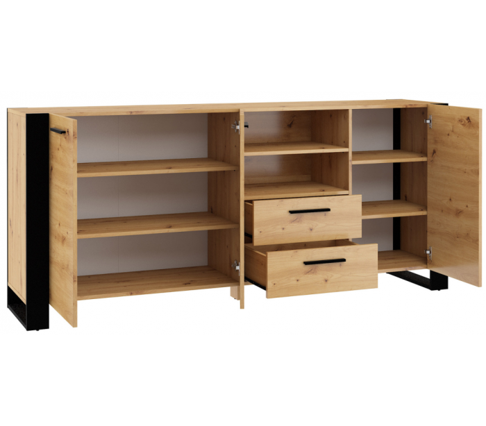 Nuka sideboard udført i et design af sort og vild egetræsfarvet møbelplade. Sideboardet måler 87 cm i højden og 197,5 x 45 cm i bredde og dybde. Sideboardet indeholder 2 skuffer samt 3 skabe, med i alt 6 hylderum. Hertil 2 åbne hylderum.