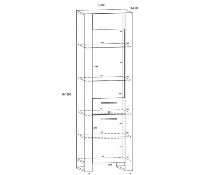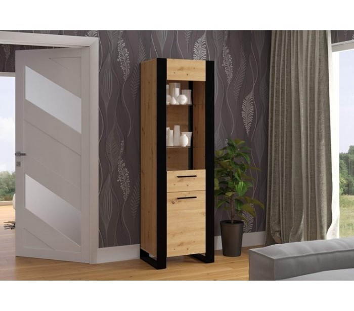 Nuka vitrineskab udført i et design af sort og vild egetræsfarvet møbelplade samt glas i døren. Vitrineskabet måler 188 cm i højden og 58 x 45 cm i bredde og dybde. Vitrineskabet indeholder 3 hylderum.