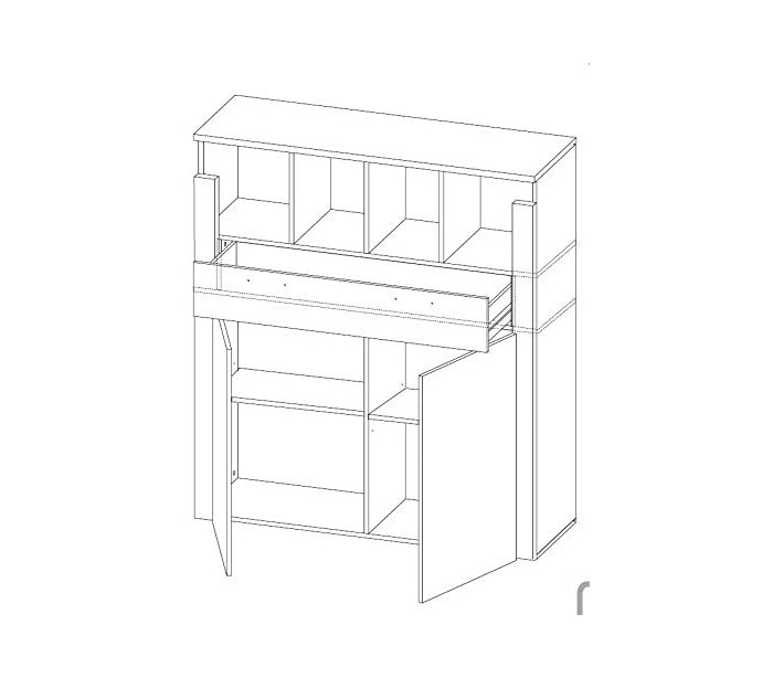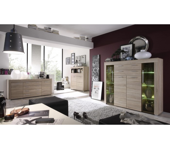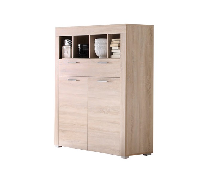 Boom sideboard udført i et design af sonoma egetræsfarvet møbelplade. Sideboardet måler 137 cm i højden og 120 x 40 cm i bredde og dybde. Sideboardet indeholder 4 åbne hylderum, 1 skuffe samt 2 skabe, med i alt 4 hylderum.