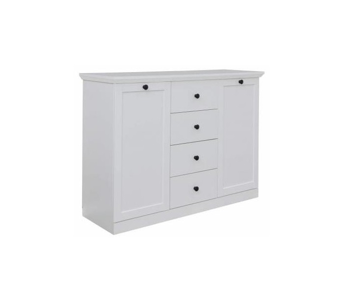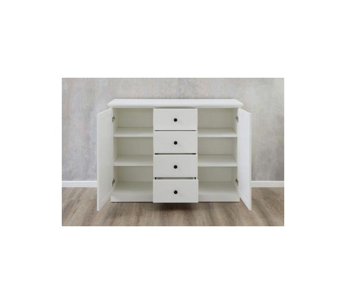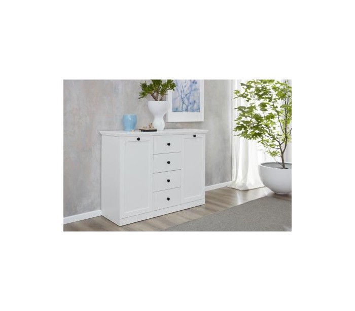 Baxter sideboard udført i et design af hvid møbelplade. Sideboardet måler 88 cm i højden og 119 x 41 cm i bredde og dybde. Sideboardet indeholder 4 skuffer samt 2 skabe med i alt 6 hylderum.