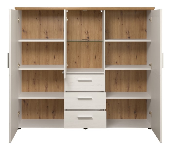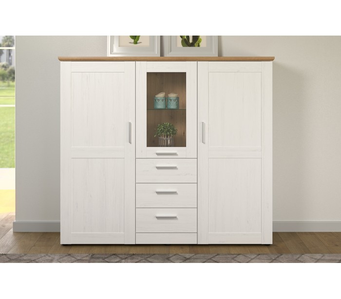 Shade vitrineskab udført i et design af antik hvid og vild egetræsfarvet møbelplade og klart glas. Vitrineskabet måler 140 cm i højden og 159 x 41 cm i bredde og dybde. Vitrineskabet indeholder 10 hylderum og 3 skuffer.