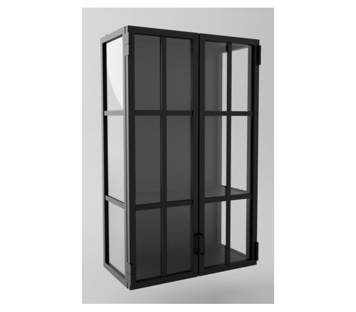 Væghængt vitrineskab udført i et industrielt design i sortlakeret stål og med lamineret sikkerhedsglas. Vitrineskabet måler 100 x 60 cm i højde og bredde.