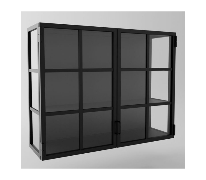 Væghængt vitrineskab udført i et industrielt design i sortlakeret stål og med lamineret sikkerhedsglas. Vitrineskabet måler 80 x 100 cm i højde og bredde.